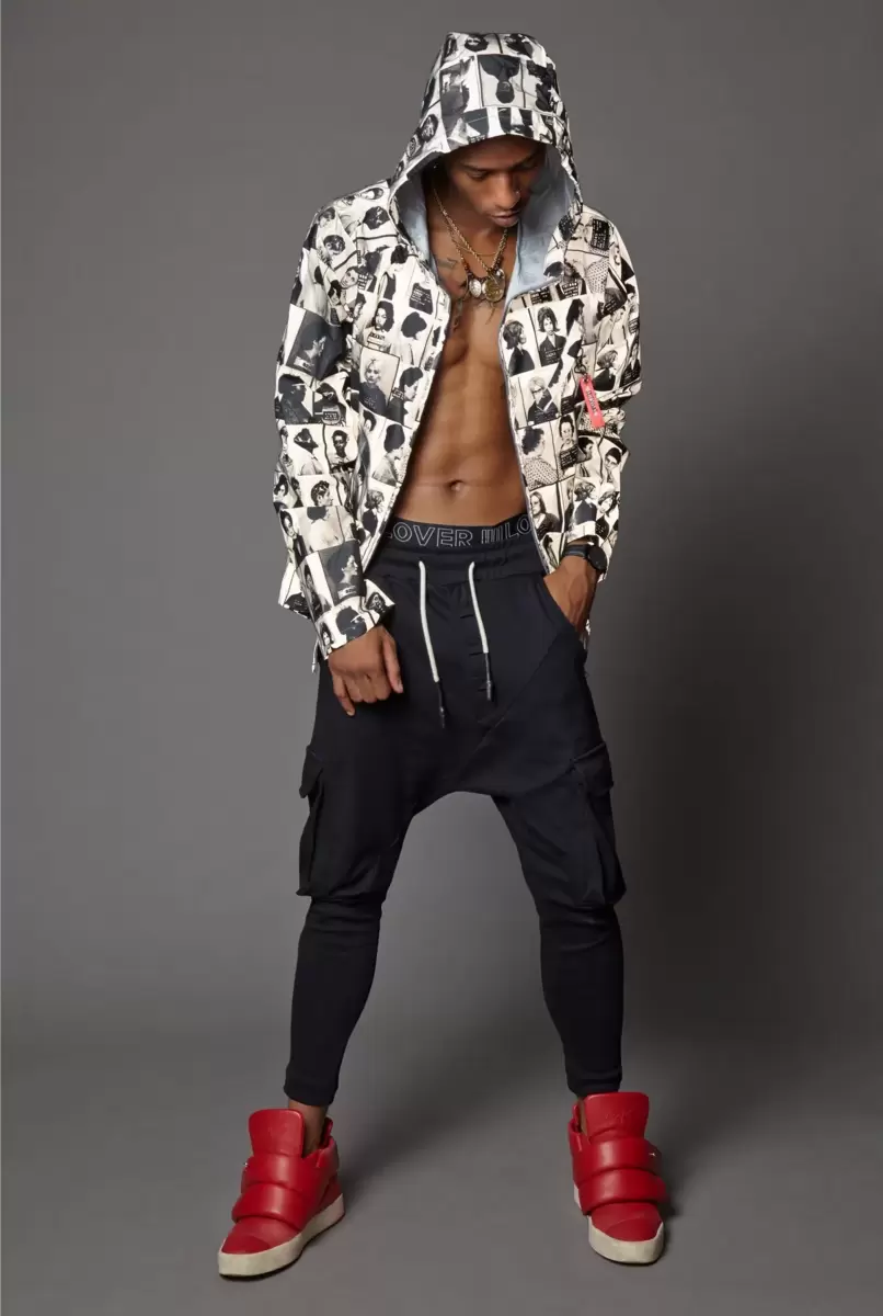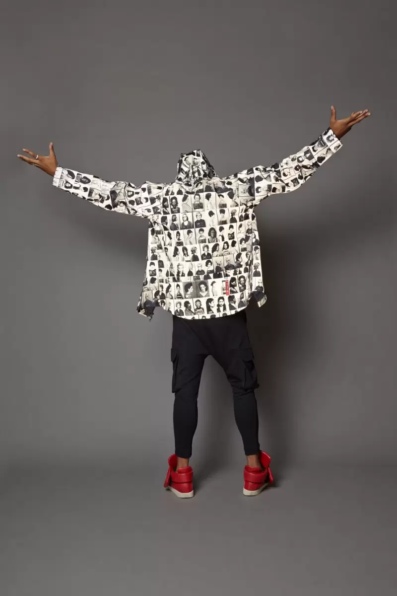Exklusive DBD x LSQ-Kollaboration aus der Scammer-Kollektion. Eine Windjacke mit 3M-Reflexmaterial und aufgedruckten Schwarz-Weiß-Fotos von einflussreichen Frauen, die im Laufe der Geschichte wegen Verbrechen verurteilt wurden.