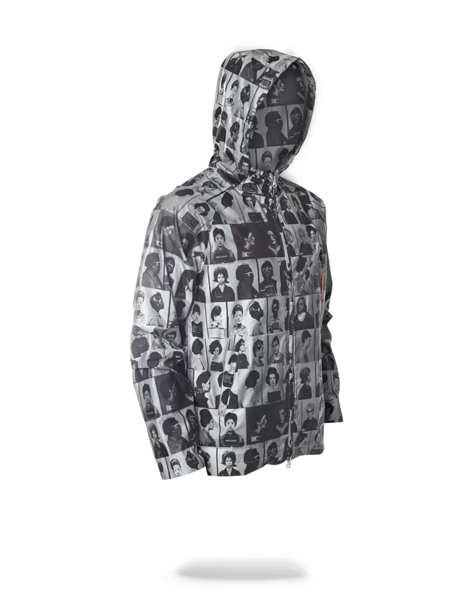 Exklusives Produkt aus der DBD x LSQ-Kollaboration der Scammer-Kollektion. Eine Windjacke mit 3M-Reflexmaterial und aufgedruckten Schwarz-Weiß-Fotos starker Frauen.