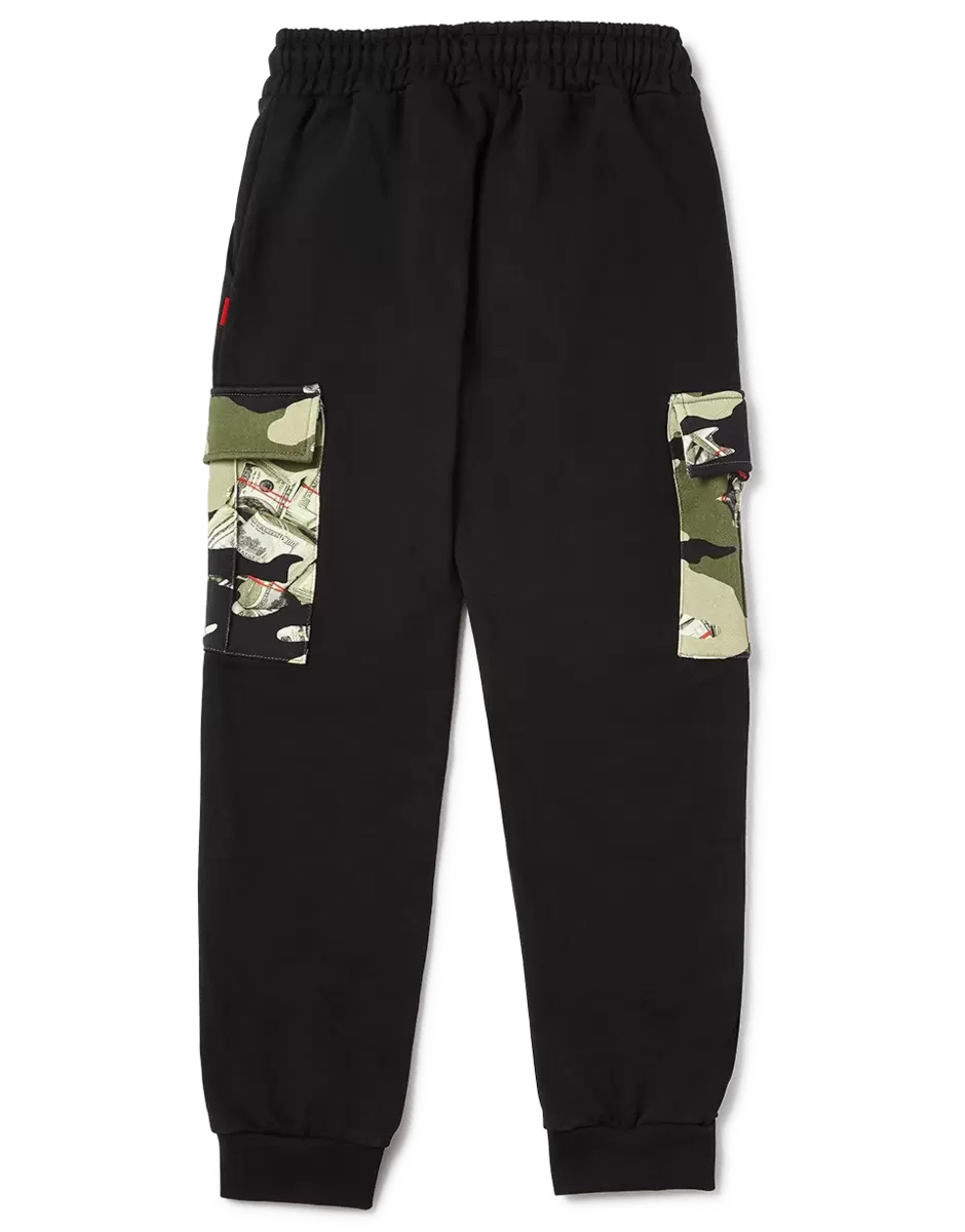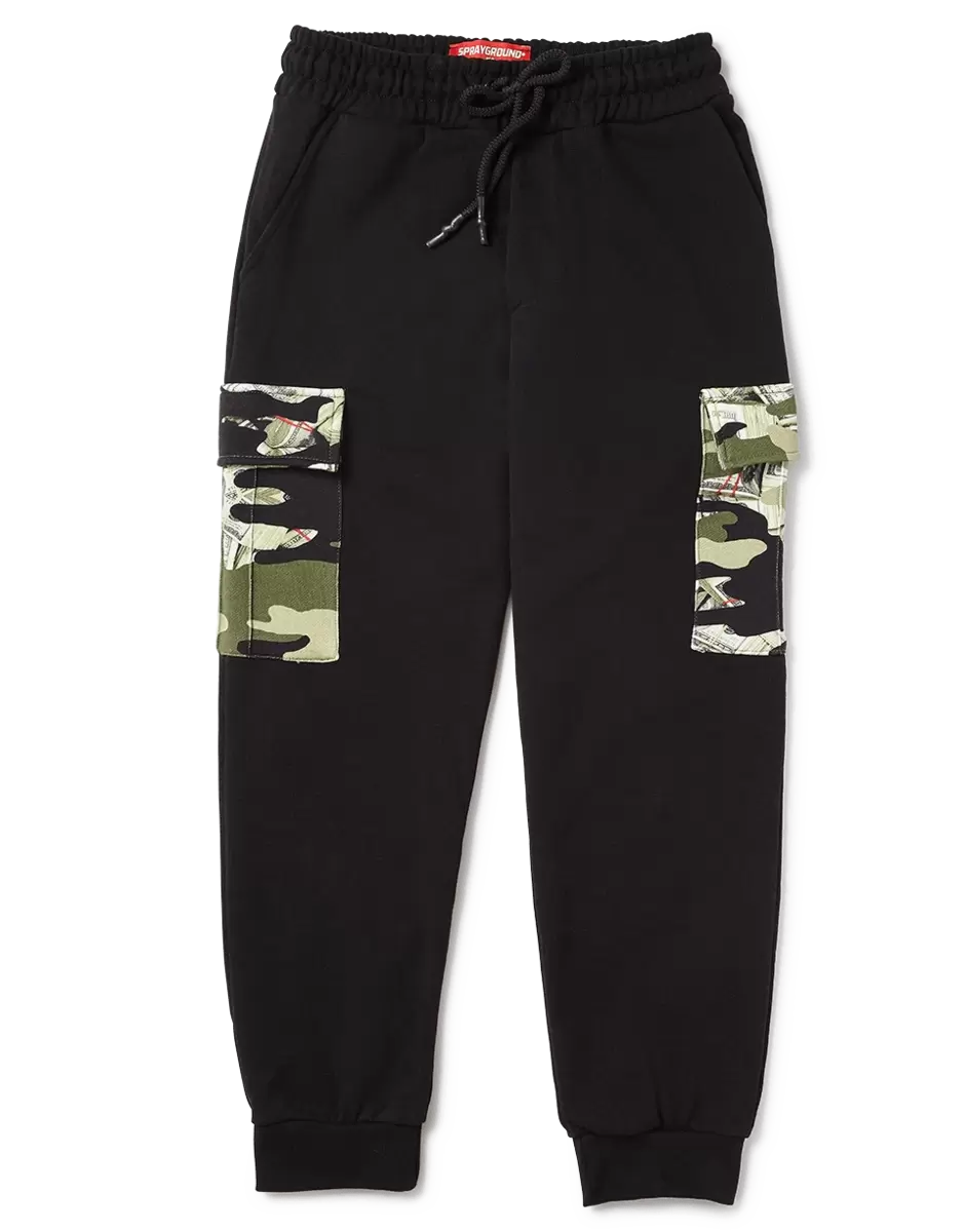 Schwarze Sprayground-Jogginghose mit Tarnmuster. Kombiniere es mit einem Sprayground-Hoodie, um den Look zu vervollständigen.