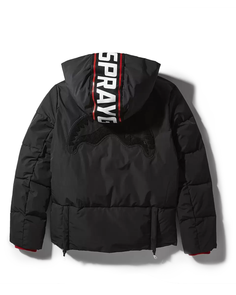 Extra mattes Nylongewebe; Silikonreißverschluss mit Sprühlogo; großer schwarzer Haifischmaul-Aufnäher hinten; elastischer Draht mit Sprühlogo und geknoteten Kordeln; Logodruck auf der abnehmbaren Kapuze