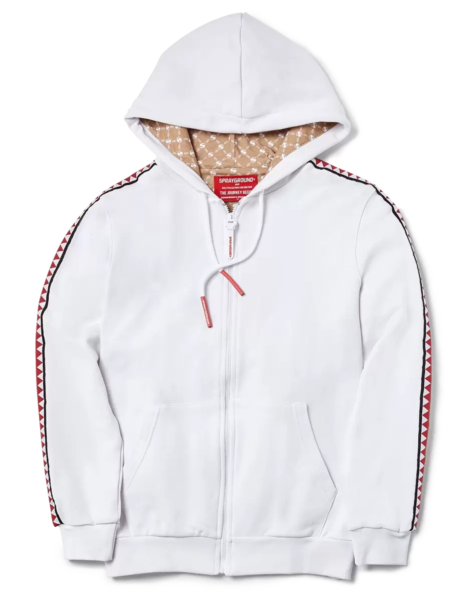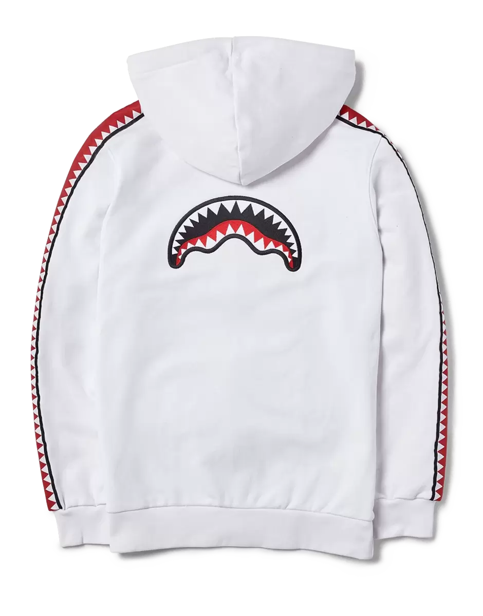 | 100 % Baumwolle Kapuzenpullover mit Reißverschluss vorne Vordertasche Bedrucktes Futter in der Kapuze Kapuze mit Kordelzug Besticktes Rückenteil Vertikales Haifischmaul-Band an den Ärmeln |