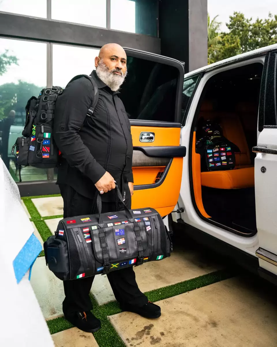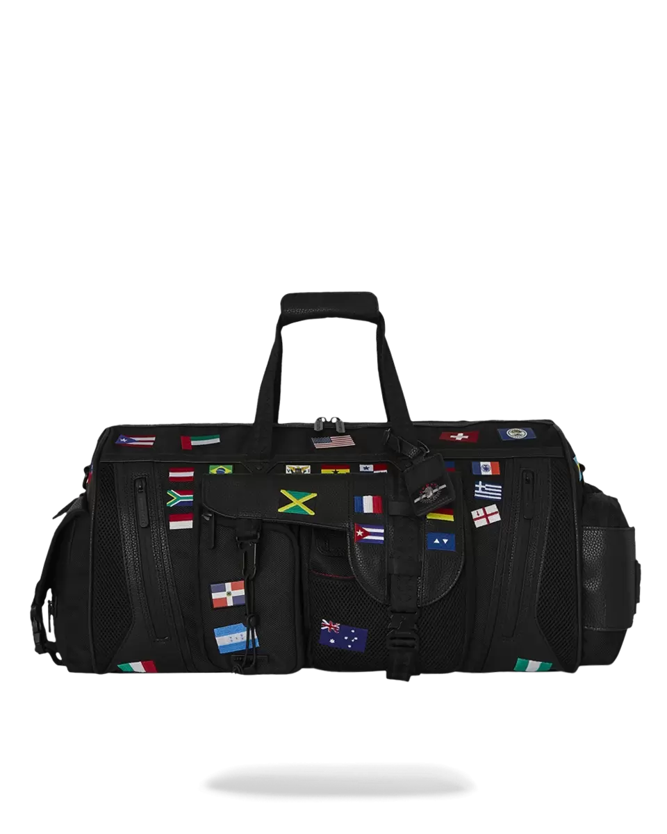 100 % ballistisches Polyester, bestickt mit Flaggenaufnähern und geprägten Details wie Haifischmaul und Reißverschlussanhängern. Ziernähte Kunstlederdetails an der vorderen Reißverschlusstasche.