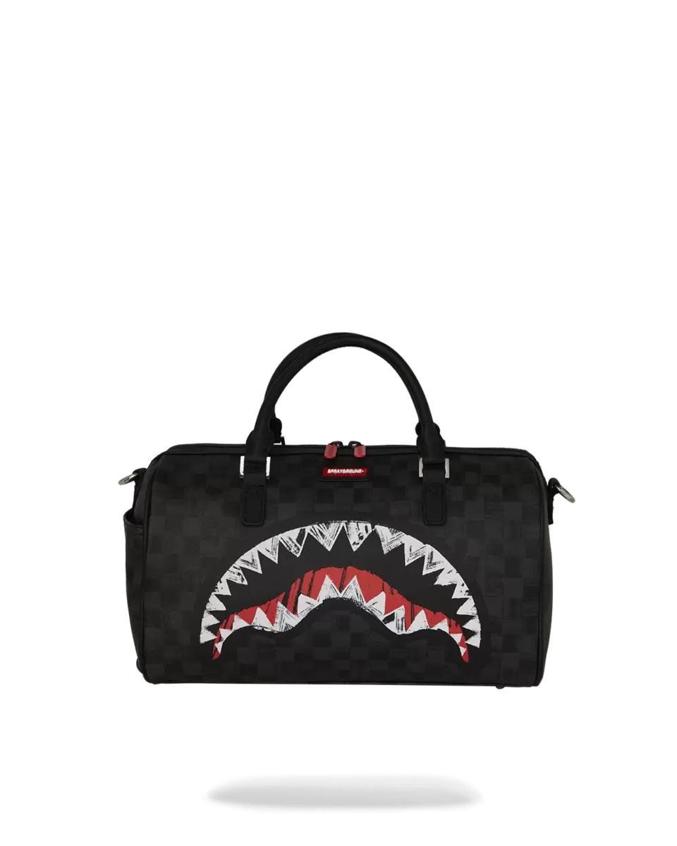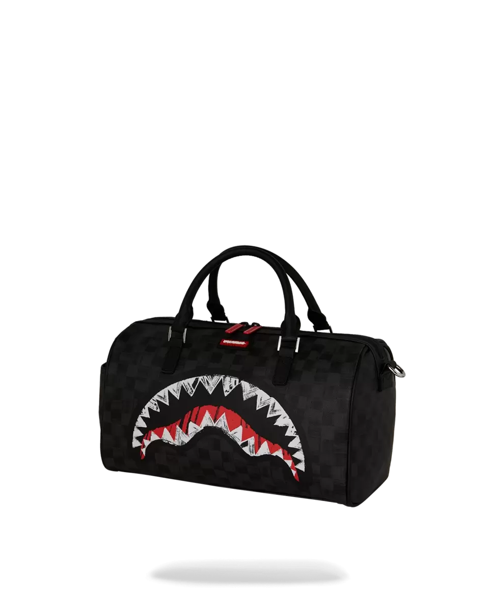 Ausgeschnittene und genähte Haifischmaulform mit geprägtem silbernen Folienbuchstaben.