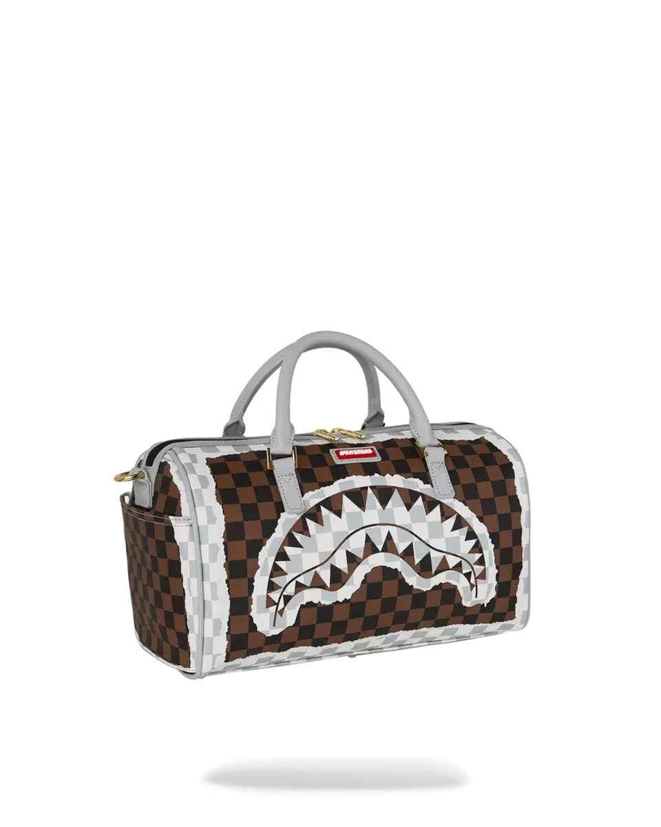 Ausgeschnittene und genähte Haifischmaulform mit geprägtem silbernen Folienbuchstaben.