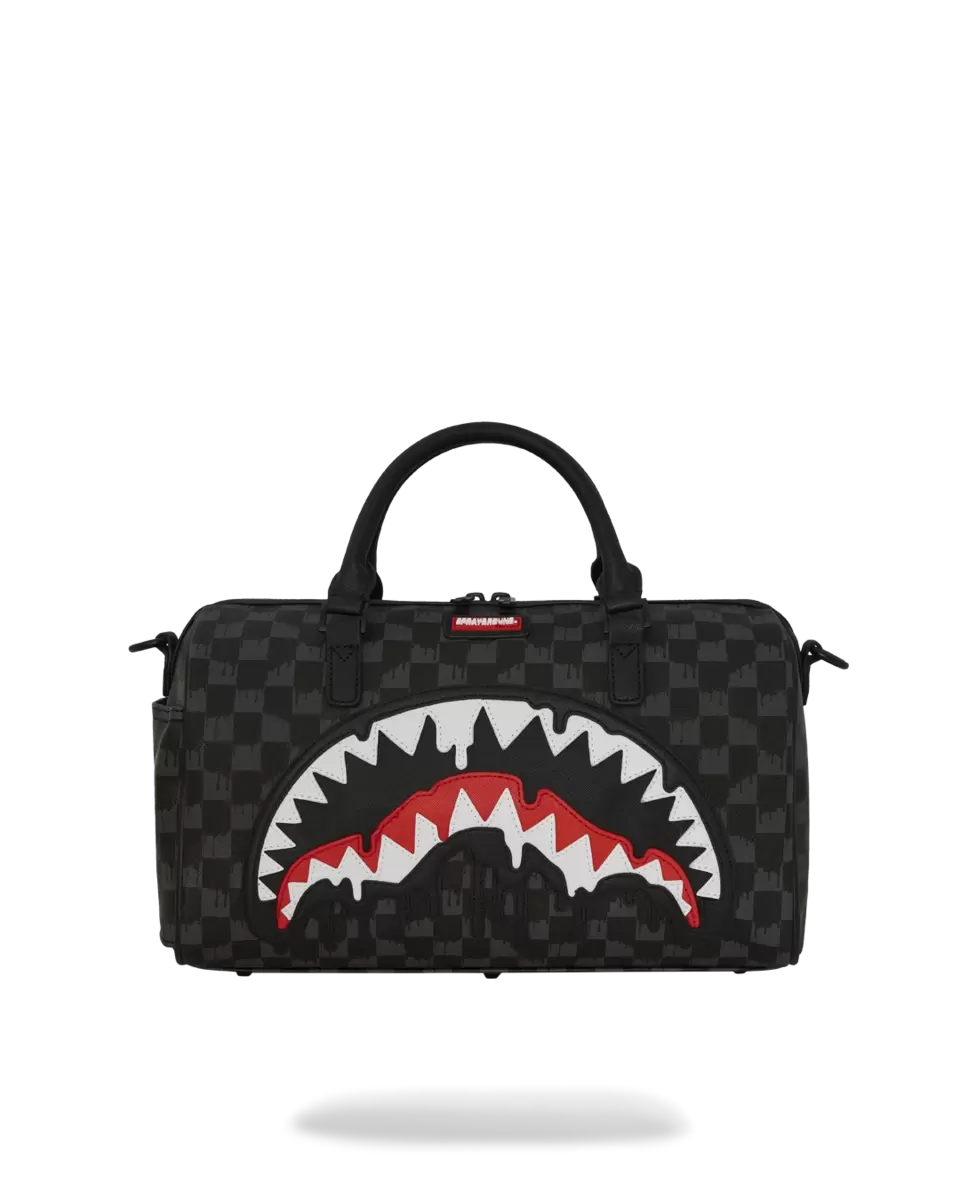 Mit aufgenähtem, tropfendem Haifischmaul. Maße: 9,5 cm (H) x 12,25 cm (B) x 6 cm (T) (unten). Neue Form, verstellbarer Schultergurt, Innentaschen – eine Reißverschlusstasche.
