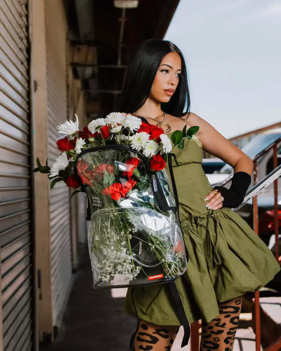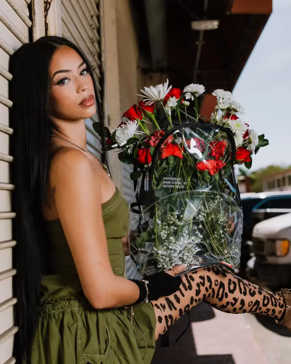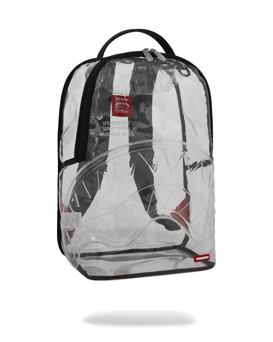 Transparenter PVC-Rucksack mit aufgenähtem Haifischmaul