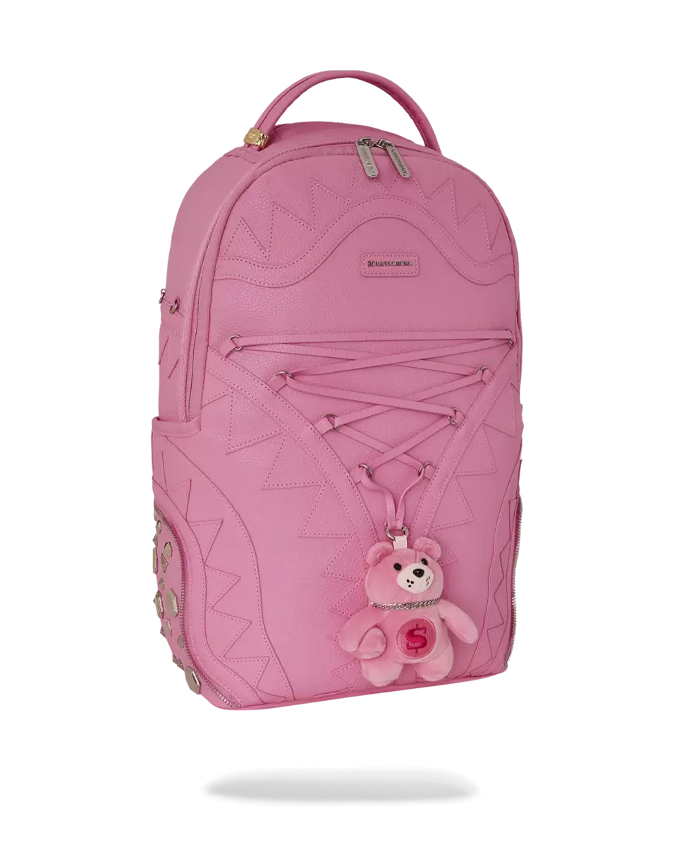 PVC mit doppelten Haifischmaul-Details, dekorativen Reißverschlussdetails mit einem Plüschbären in der Mitte, PVC-Spitzenbesatz, Seitenwände mit silbernen Metallnieten