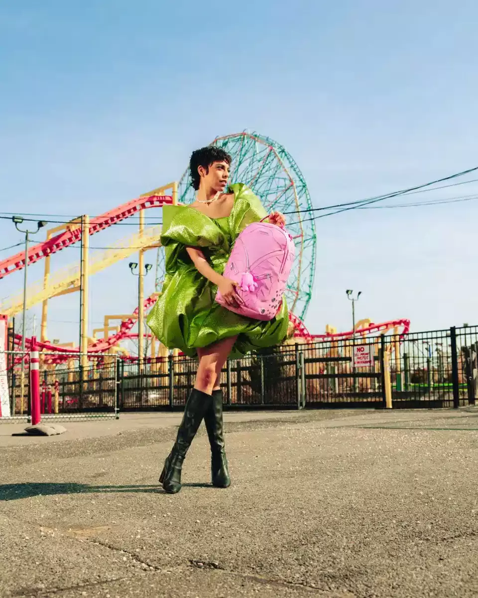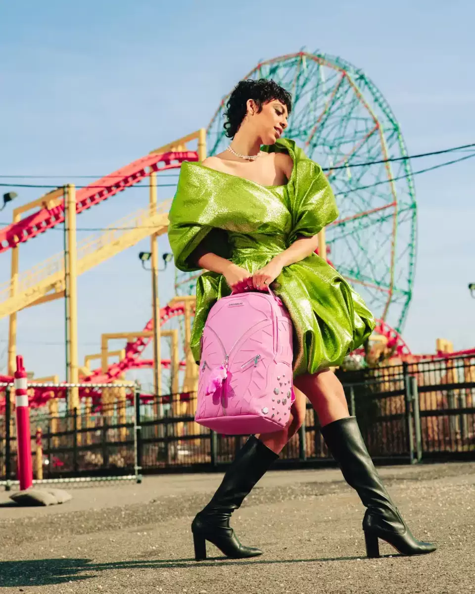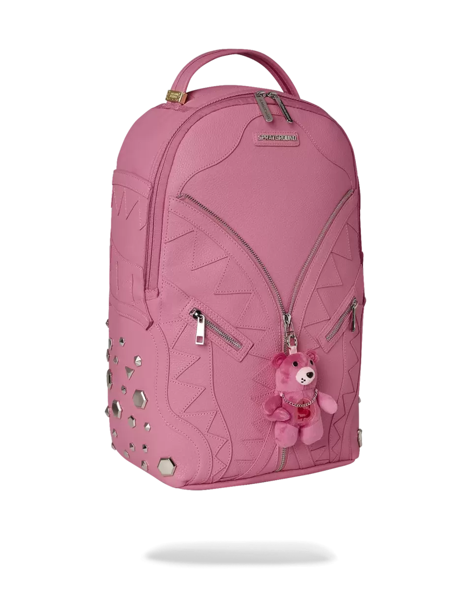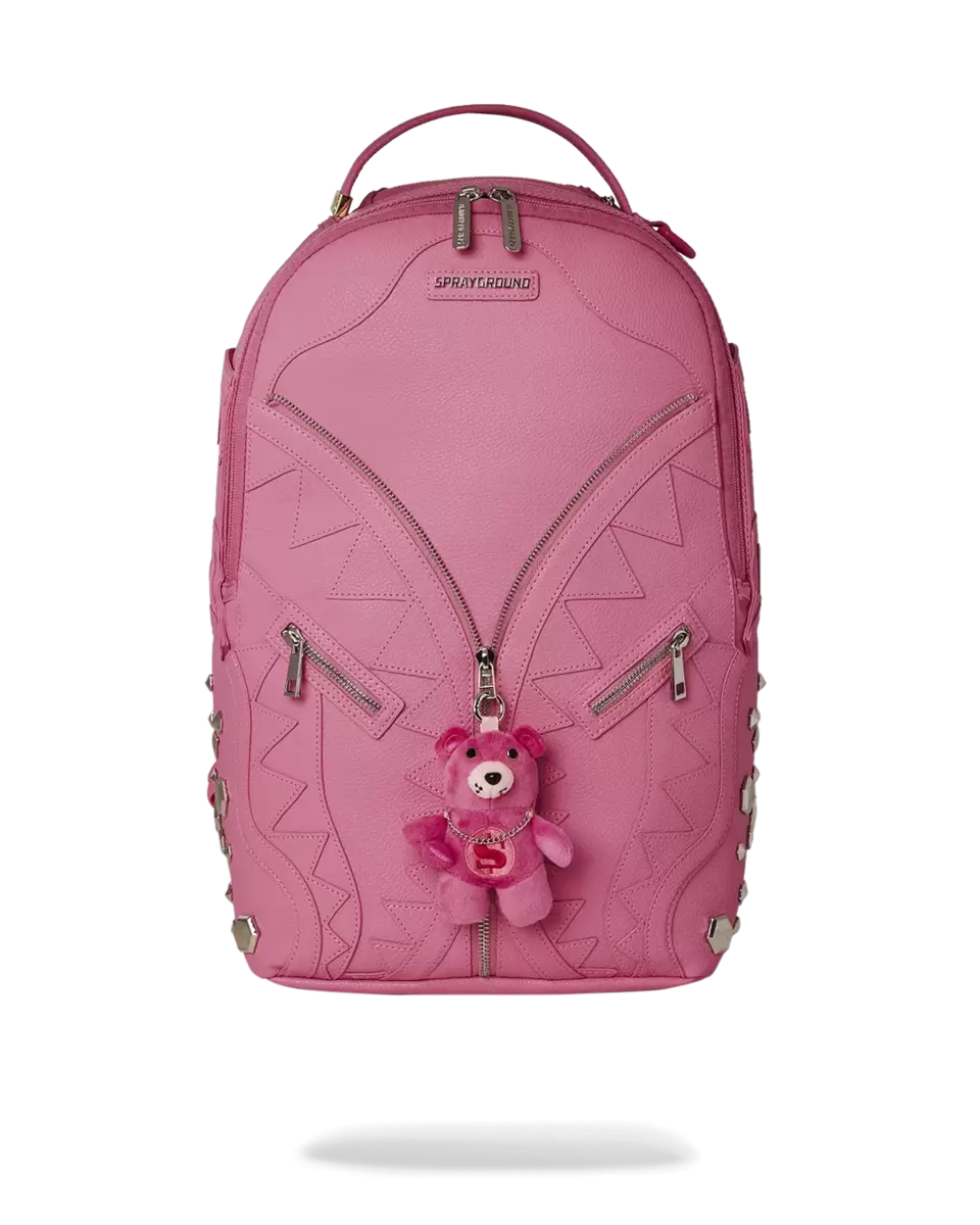 PVC mit doppelten Haifischmaul-Details, dekorativen Reißverschlussdetails mit einem Plüschbären, der von der Mitte hängt, Seitenwände mit silbernen Metallnieten verziert