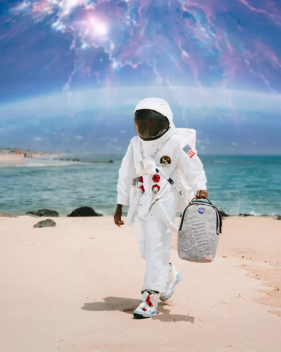 Offizielle Kooperation mit der NASA. Geprägter Fußabdruck. Außenmaße: 18 x 6 x 11,5 cm. Vordertasche mit Reißverschluss, Seitentaschen, Reißverschlusstasche, separates Veloursfach.