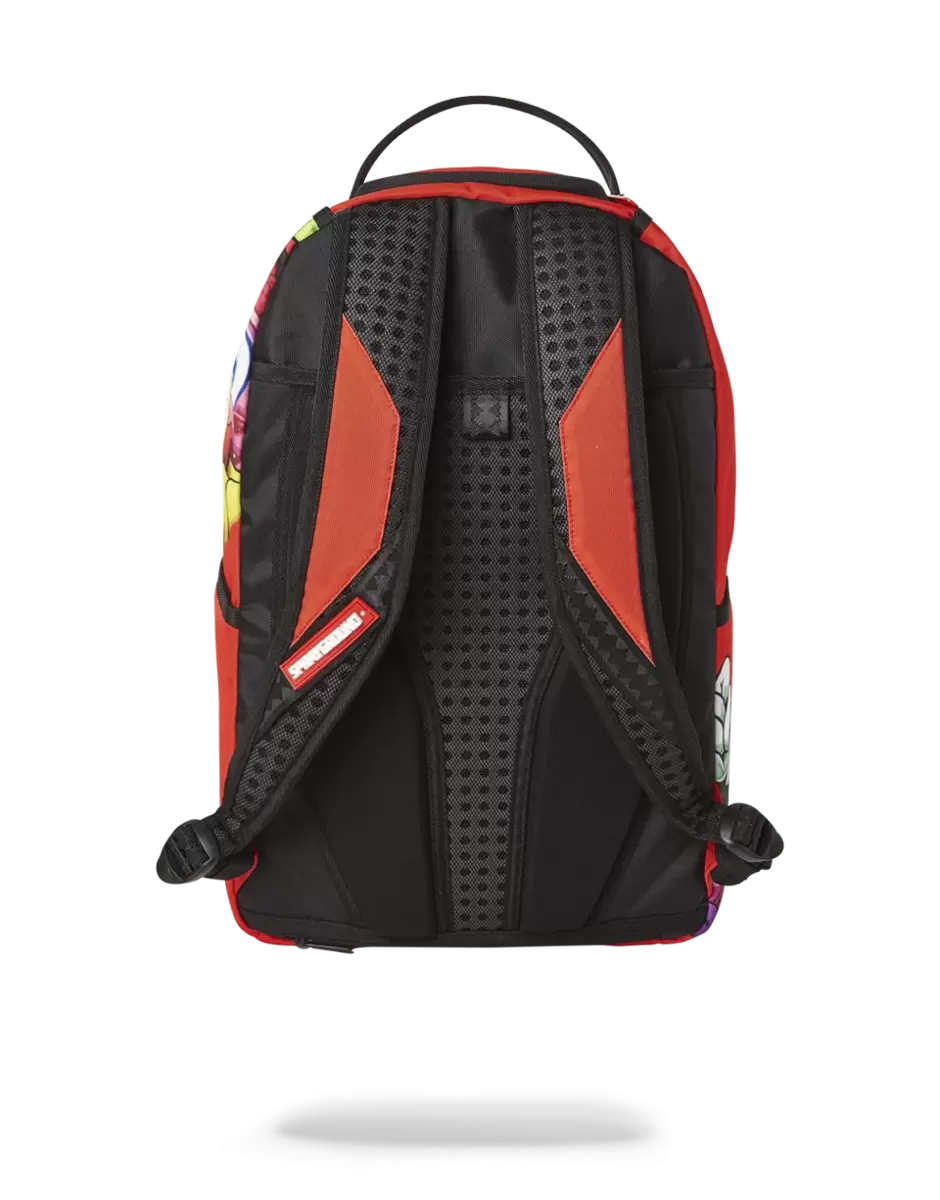 Abmessungen: 45,7 x 15,2 x 29,2 cm Vordertasche mit Reißverschluss Seitentaschen Reißverschlusstasche Separates Brillenfach aus Velours Ergonomische Netzrückenpolsterung Verstellbare Gurte für individuelle Anpassung Rote Reißverschlüsse mit Metallbeschlägen Metallplakette „Sprayground Authentic“ Durchschubtasche auf der Rückseite zur Befestigung am Handgepäck für freie Hände