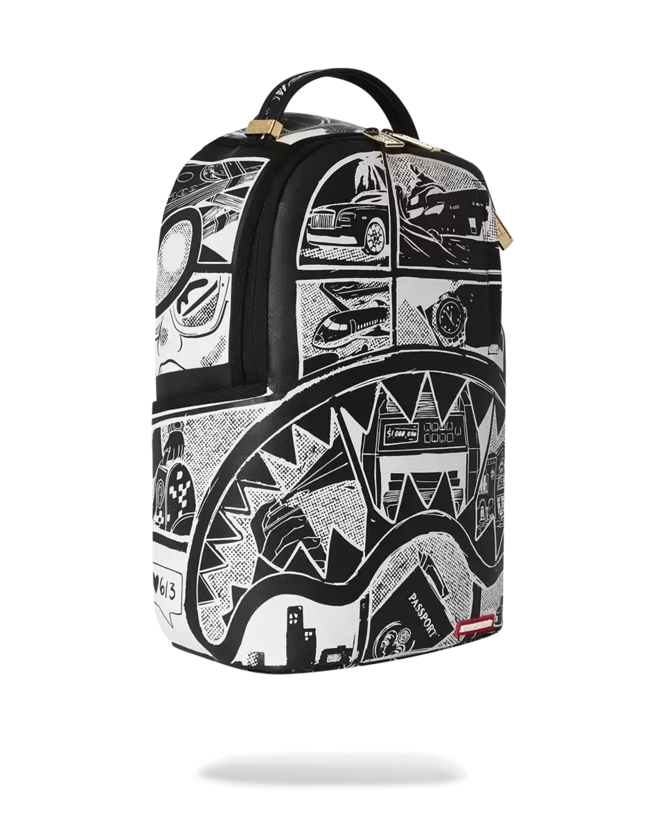 Abmessungen: 45,7 x 15,2 x 29,2 cm Vordertasche mit Reißverschluss Seitentaschen Reißverschlusstasche Separates Brillenfach aus Velours Ergonomische Netzrückenpolsterung Verstellbare Riemen für individuelle Anpassung Goldfarbene Reißverschlüsse mit Metallbeschlägen Metall-Badge „Sprayground Authentic“ Durchschubschlaufe am Rücken zur Befestigung am Handgepäck für freie Hände