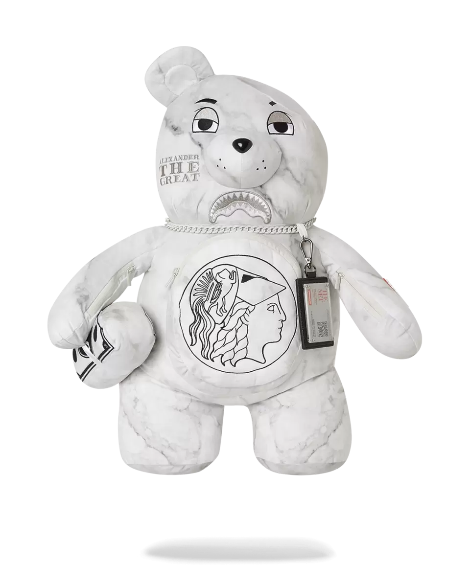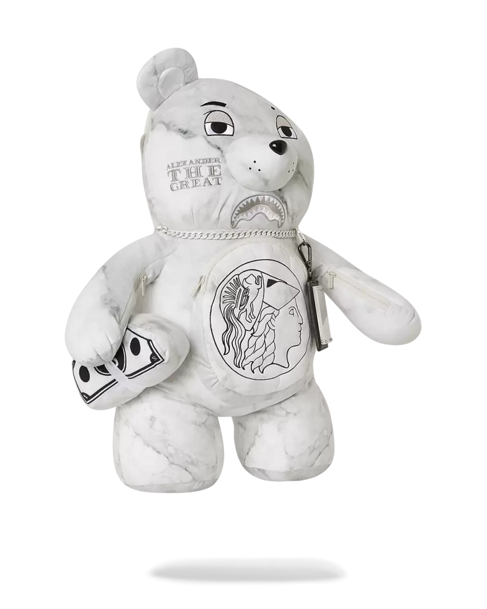 Unser charakteristischer Money Bear Rucksack erstrahlt dank Sprayground in neuem Glanz. Inspiriert von einer antiken Skulptur, zeigt dieser bärenförmige Rucksack das Abbild einer makedonischen Münze (336–323 v. Chr.), die im Namen Alexanders des Großen geprägt wurde und sich heute in der Sammlung griechisch-römischer Kunst des Museums befindet. Die originale Goldmünze zeigt auf der einen Seite den Kopf der Athene und auf der anderen Seite den der Nike, beides Göttinnen, die mit dem Sieg im Krieg in Verbindung gebracht wurden.