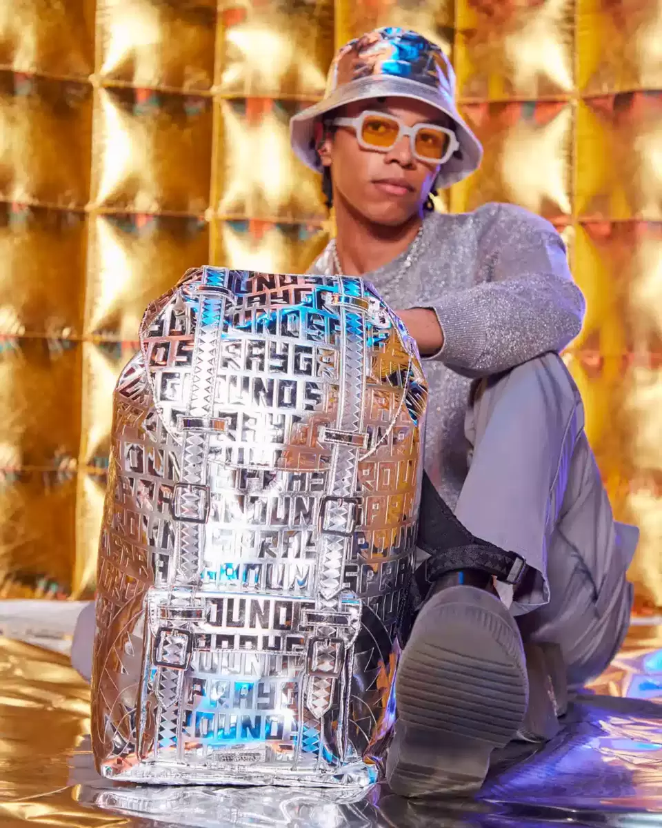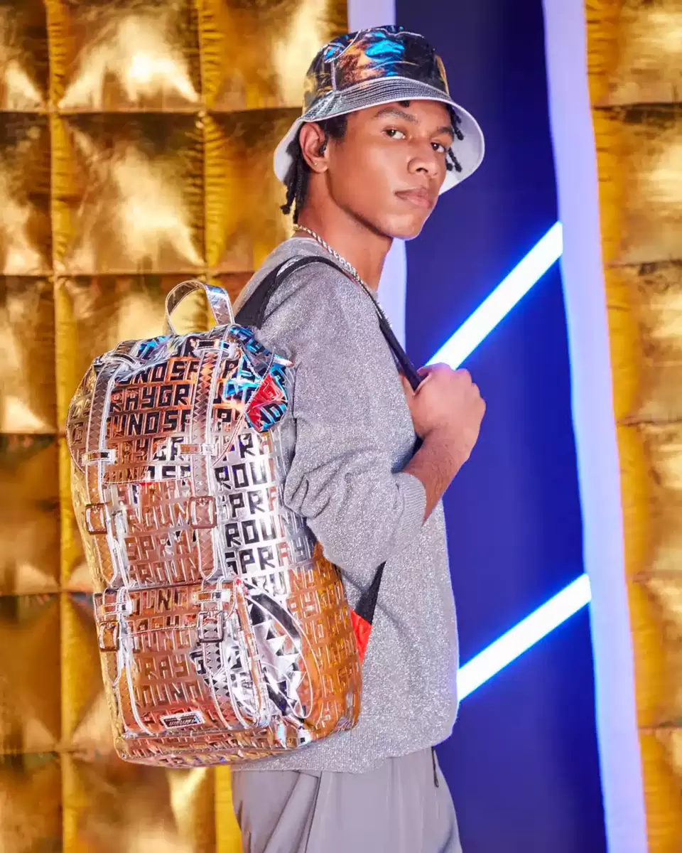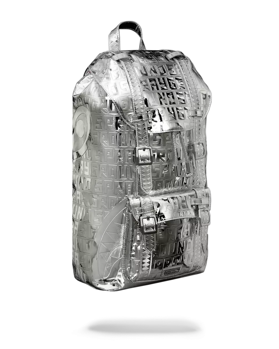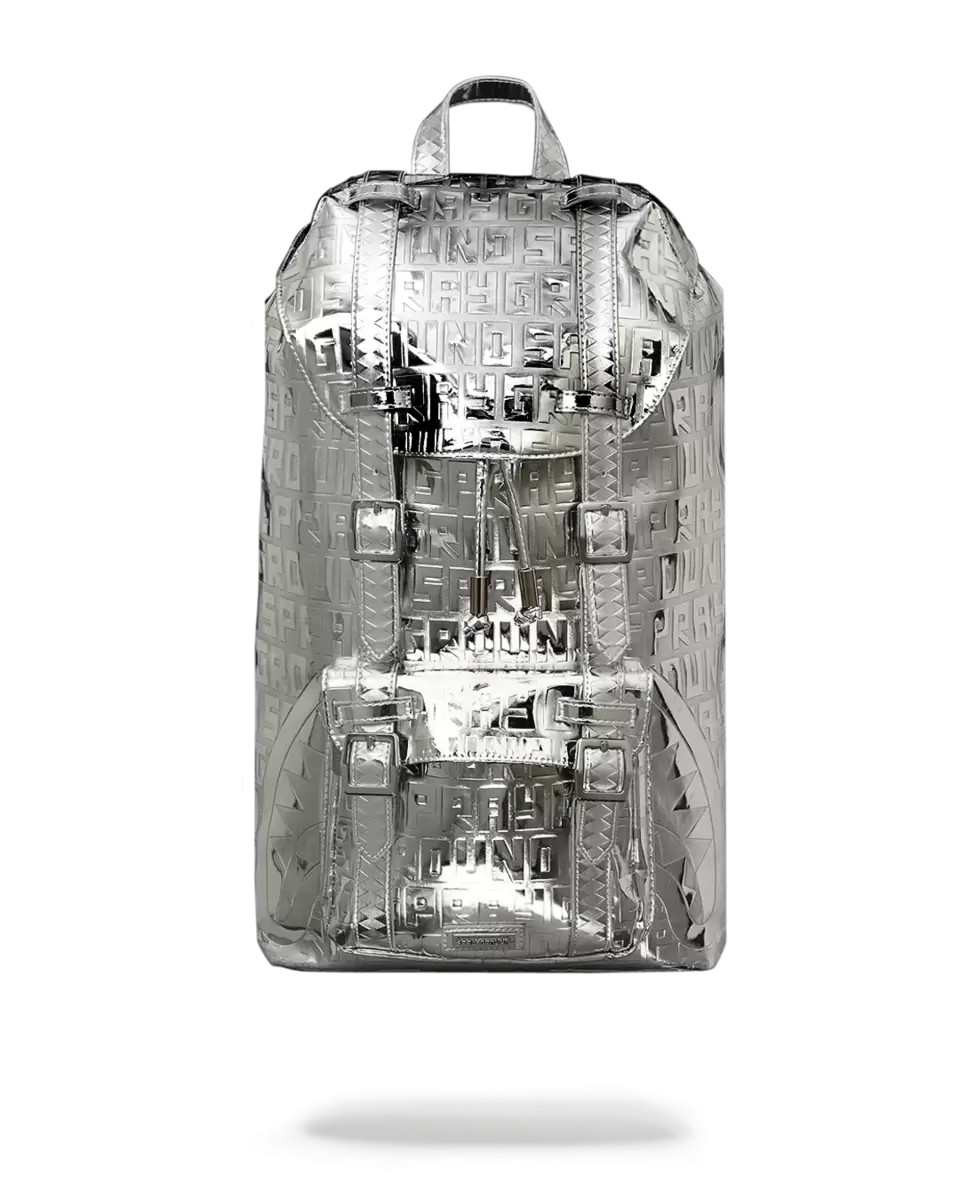 Geprägtes Sprayground-Logo auf metallisch-silbernem PU mit spiegelndem Glanz