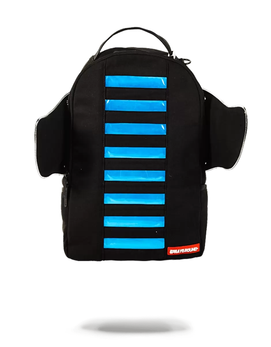 Abmessungen: 45,7 x 15,2 x 29,2 cm ∙ Vordertasche mit Reißverschluss ∙ Seitentaschen ∙ Reißverschlusstasche ∙ Ergonomische Netzrückenpolsterung ∙ Verstellbare Gurte für individuelle Passform ∙ Nylon-Reißverschlüsse mit Metallbeschlägen ∙ Metall-Badge „Sprayground Authentic“ ∙ Durchschubtasche auf der Rückseite zur Befestigung am Handgepäck für freie Hände ∙ LED-Beleuchtung an Vorderseite und Flügeln, aktivierbar über einen „Illuminate“-Knopf an den Gurten