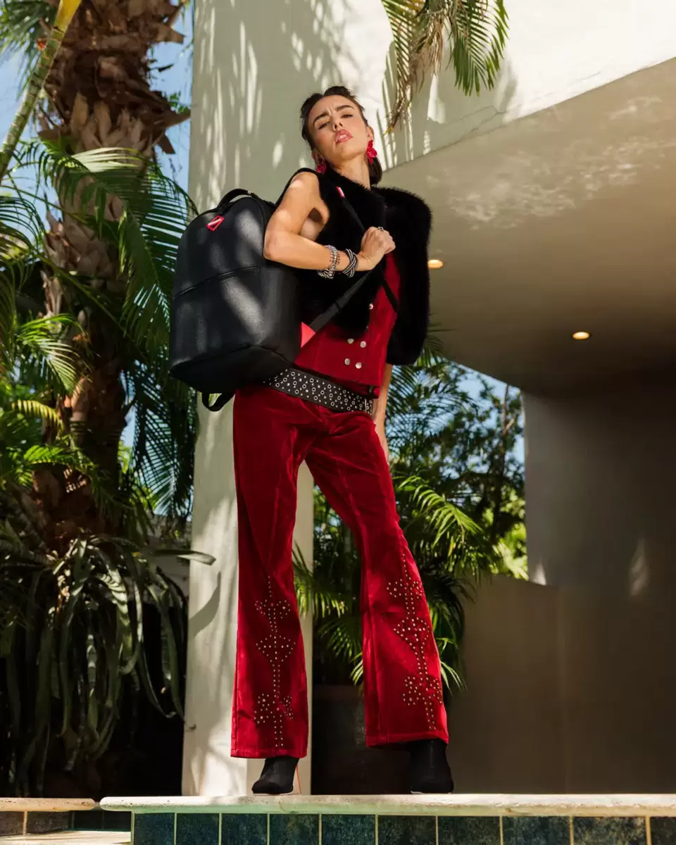 PVC-Rucksack mit einer Reißverschlusstasche vorne und speziellem Diamant-Metall-Emblem