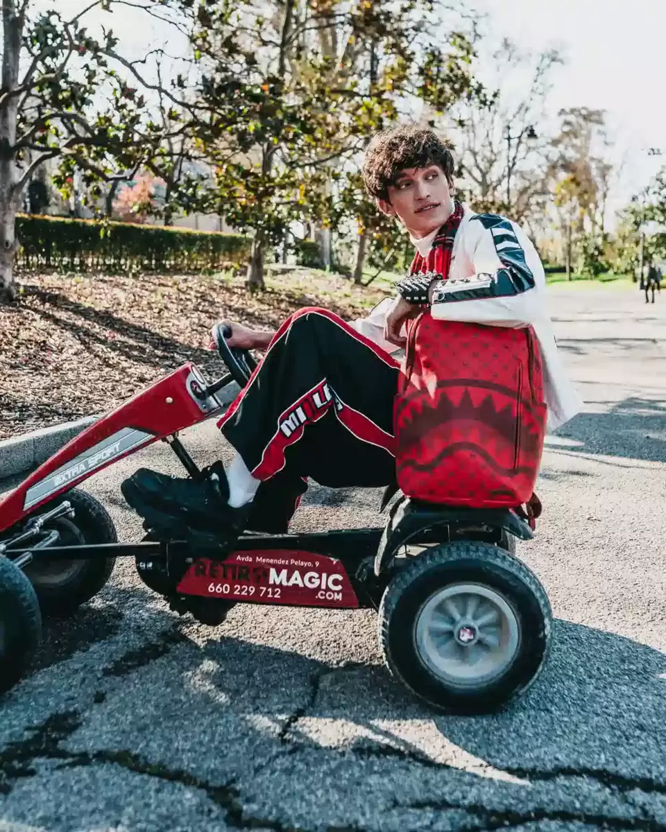 Abmessungen: 45,7 x 15,2 x 29,2 cm Vordertasche mit Reißverschluss Seitentaschen Reißverschlusstasche Separates Brillenfach aus Velours Ergonomische Netzrückenpolsterung Verstellbare Riemen für individuelle Anpassung Rote Reißverschlüsse mit Metallbeschlägen Metall-Badge „Sprayground Authentic“ Durchschubtasche auf der Rückseite zur Befestigung am Handgepäck für freie Hände