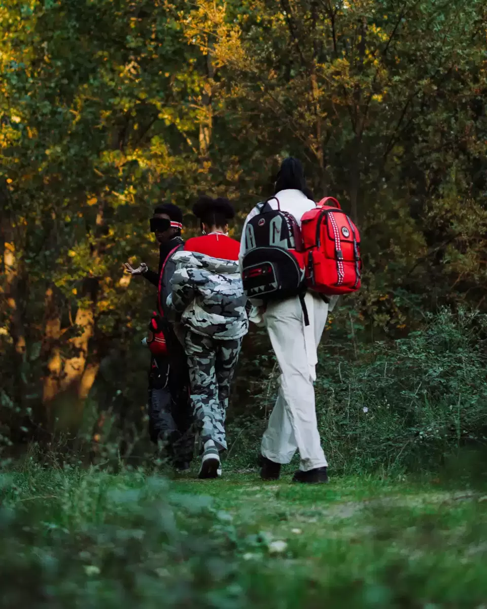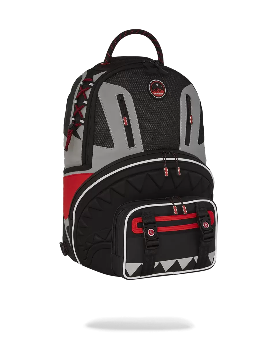 Sky High Seekers Emblem, Neopren-Gewebe, geschweißte, geprägte Rückenpartie, roter Kordelgriff und Details, geprägte Neoprentasche, gummierte PVC-Details, wasserabweisende Taschen, spezielle Reißverschluss-Zieher, Gummiboden, 3M reflektierende Paspeln und Details