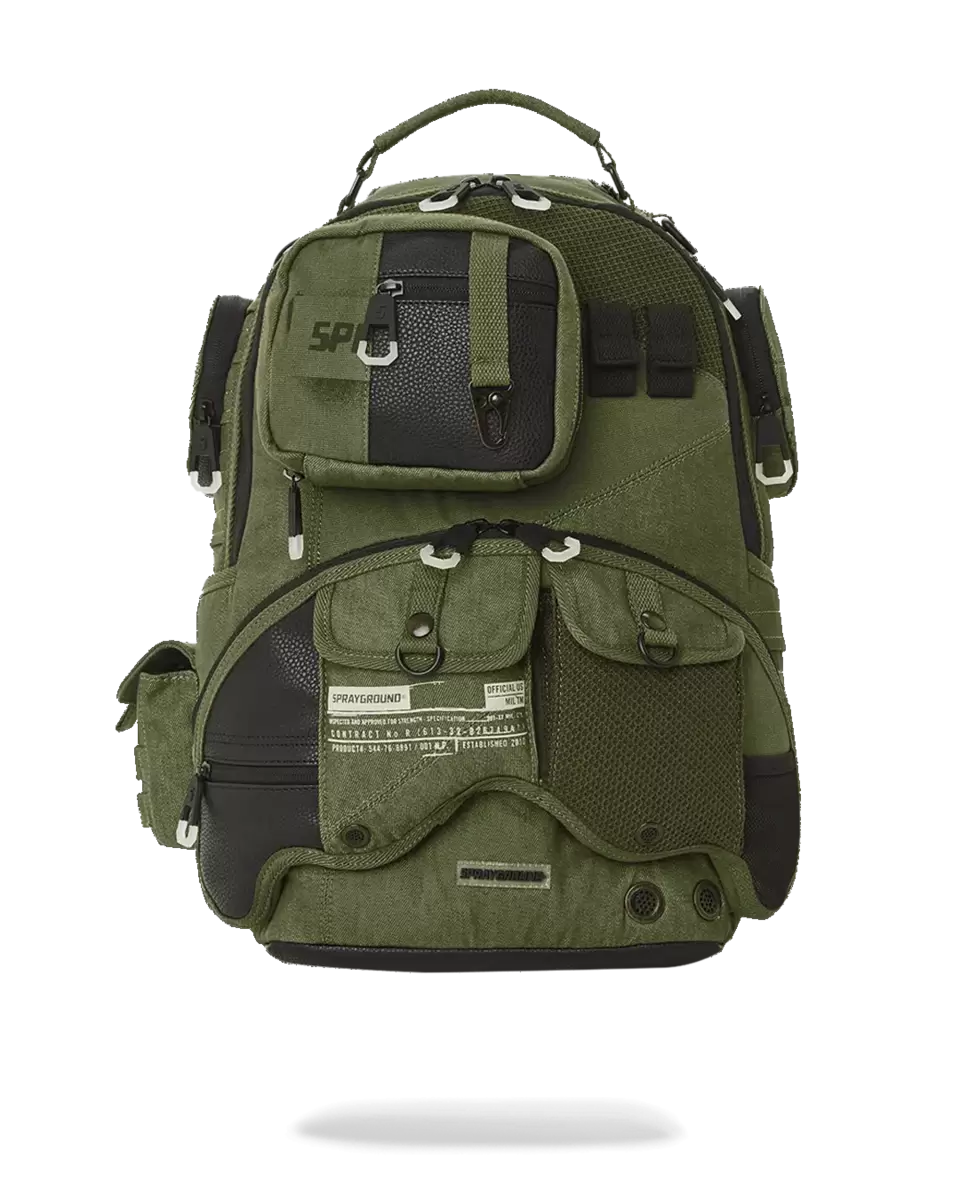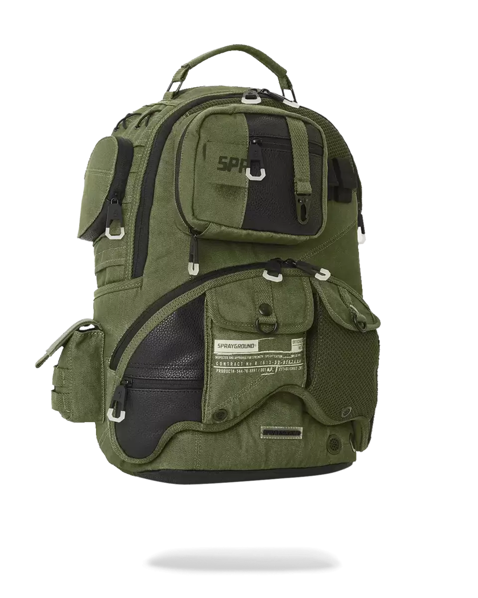 Maße: 45,7 x 15,2 x 29,2 cm Reißverschlusstasche vorne Seitentaschen Reißverschlusstasche Separates Sonnenbrillenfach aus Velours Verstellbare Riemen für individuelle Anpassung Goldfarbene Reißverschlüsse mit Metallbeschlägen Metallplakette „Sprayground Authentic“