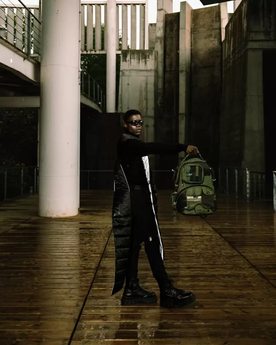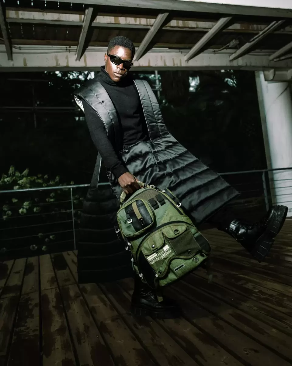 Verziert mit Cargotaschen in Haifischform, Ösen und Clips.