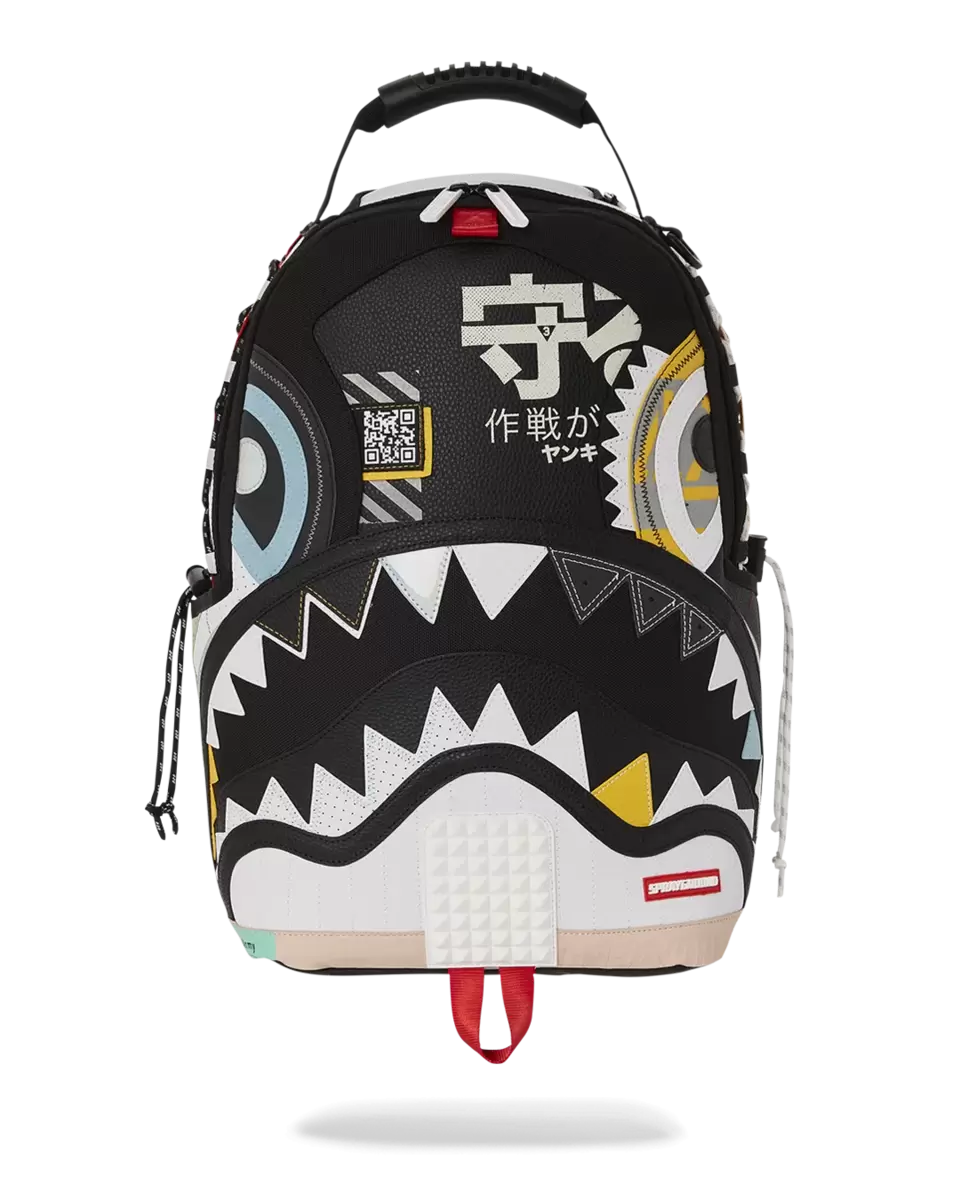 Abmessungen: 45,7 x 15,2 x 29,2 cm Vordertasche mit Reißverschluss Seitentaschen Reißverschlussfach Separates Brillenfach aus Velours Ergonomische Rückenpolsterung aus Netzgewebe Verstellbare Träger für individuelle Passform Goldfarbene Reißverschlüsse mit Metallbeschlägen Metall-Badge „Sprayground Authentic“ Durchschubtasche am Rücken zur Befestigung am Handgepäck für freie Hände