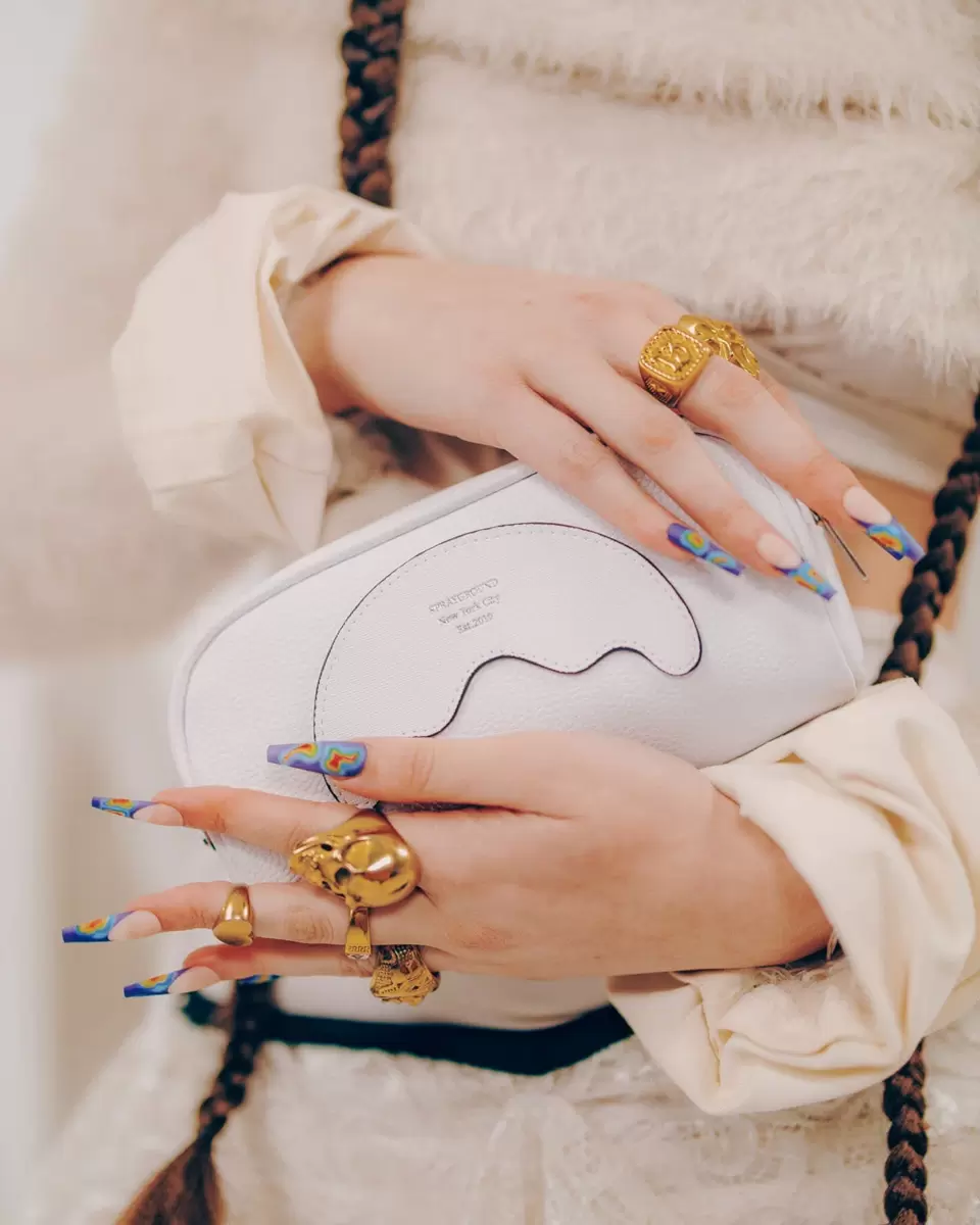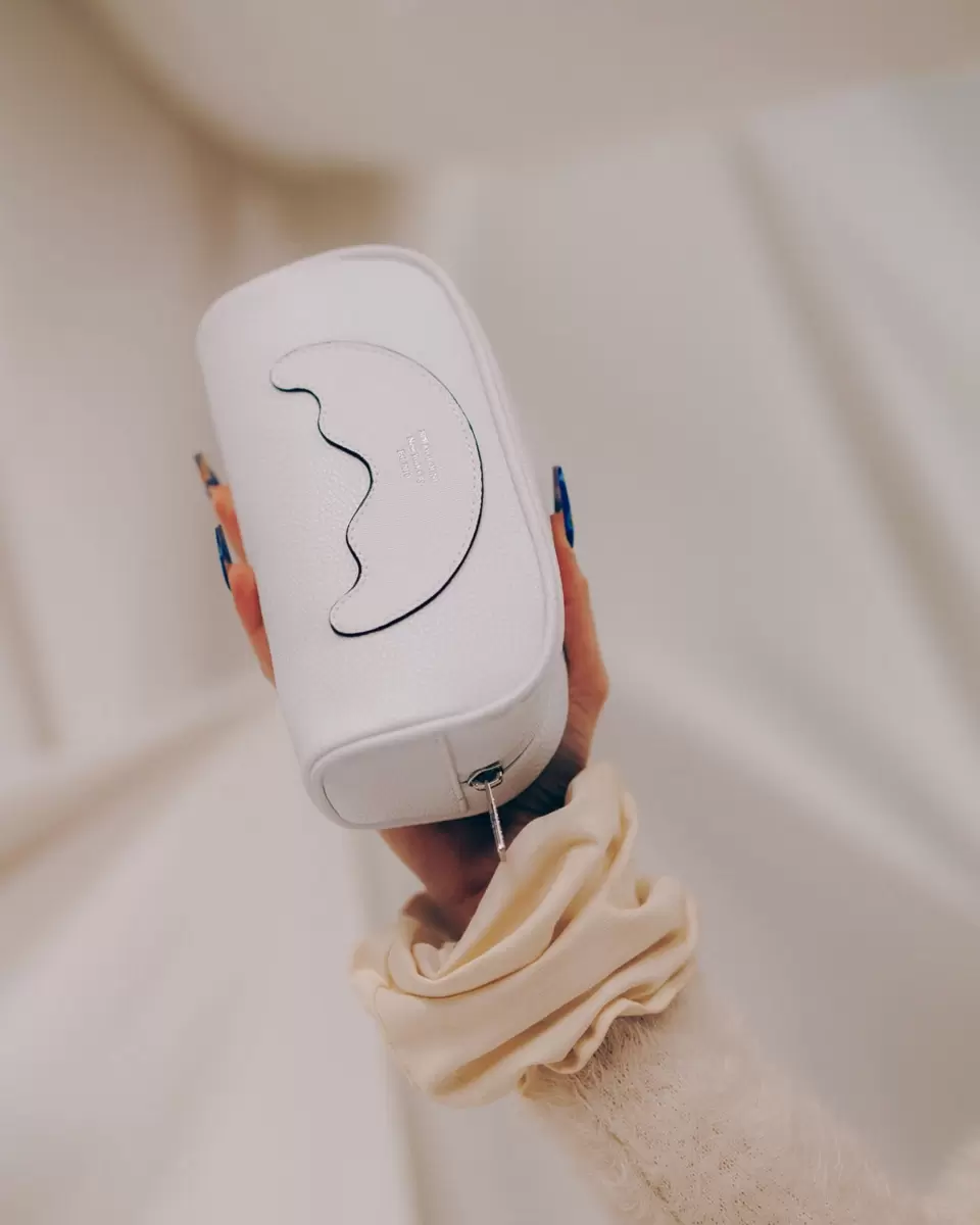 Ausgeschnittenes und genähtes Täschchen in Haifischmaulform mit geprägter silberner Folienbeschriftung.