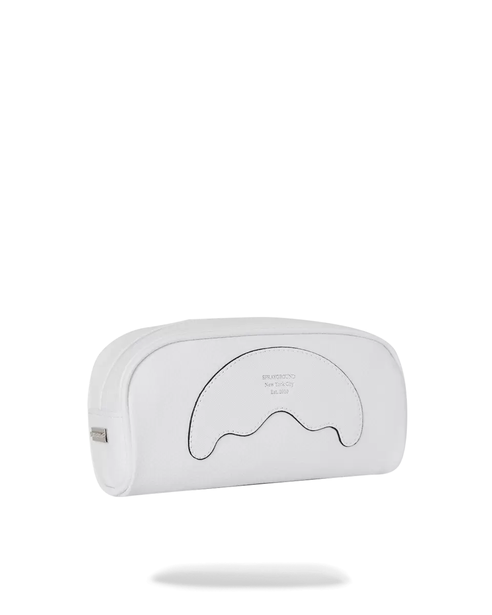 Ausgeschnittene und genähte Haifischmaulform mit geprägter silberner Folienbeschriftung. Kleines Täschchen, ideal für Stifte, Make-up und vieles mehr. Maße: 4 x 2,75 x 8 cm. Mit Reißverschluss.