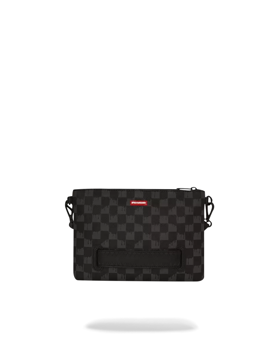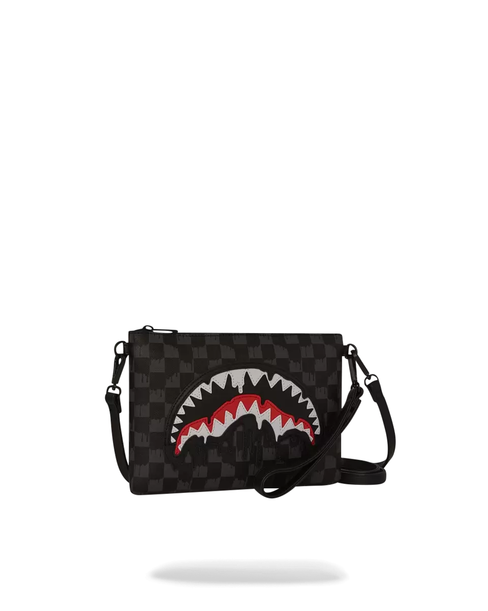 Die wandelbare Clutch „Pouchette“ besticht durch ein aufgenähtes, tropfenförmiges Haifischmaul-Design, eine abnehmbare Handschlaufe, einen Tragegriff an der Vorderseite, einen Reißverschluss und ein Innenfach.