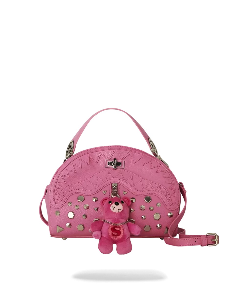 Haifischmaul mit Metallnieten, silbernem Drehverschluss, abnehmbarem und verstellbarem Riemen, Henkel mit silbernem „S/G“-Logo, 1 Reißverschlussfach innen, Plüschbär