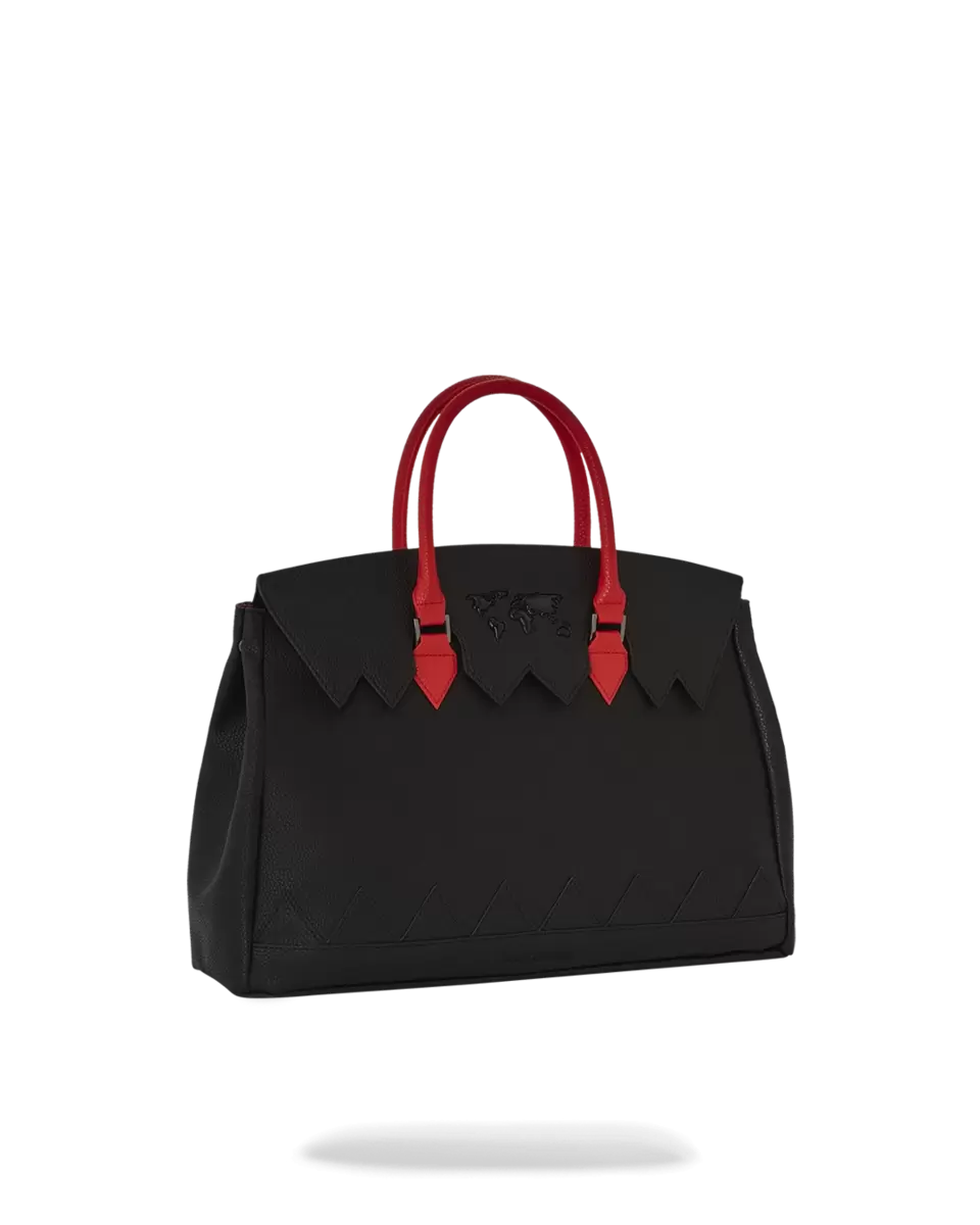 H 30,5 cm x B 38 cm x T 12,5 cm, Henkelfall 10 cm, Druckknopfverschluss, erweiterbare seitliche Druckknöpfe, Schutzfüße am Boden, Emaille-Augen-Details, innen mit großem Reißverschlussfach