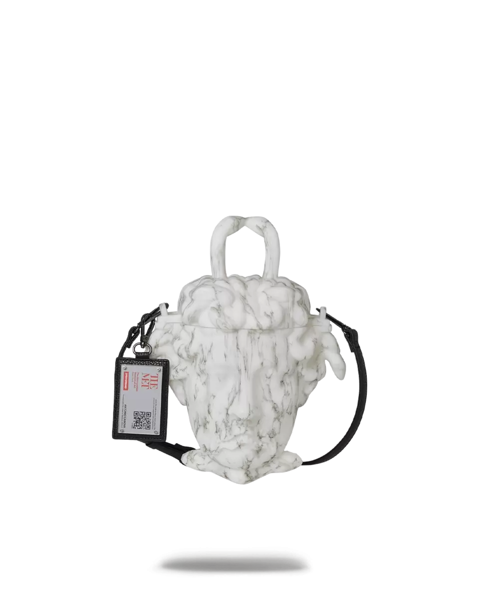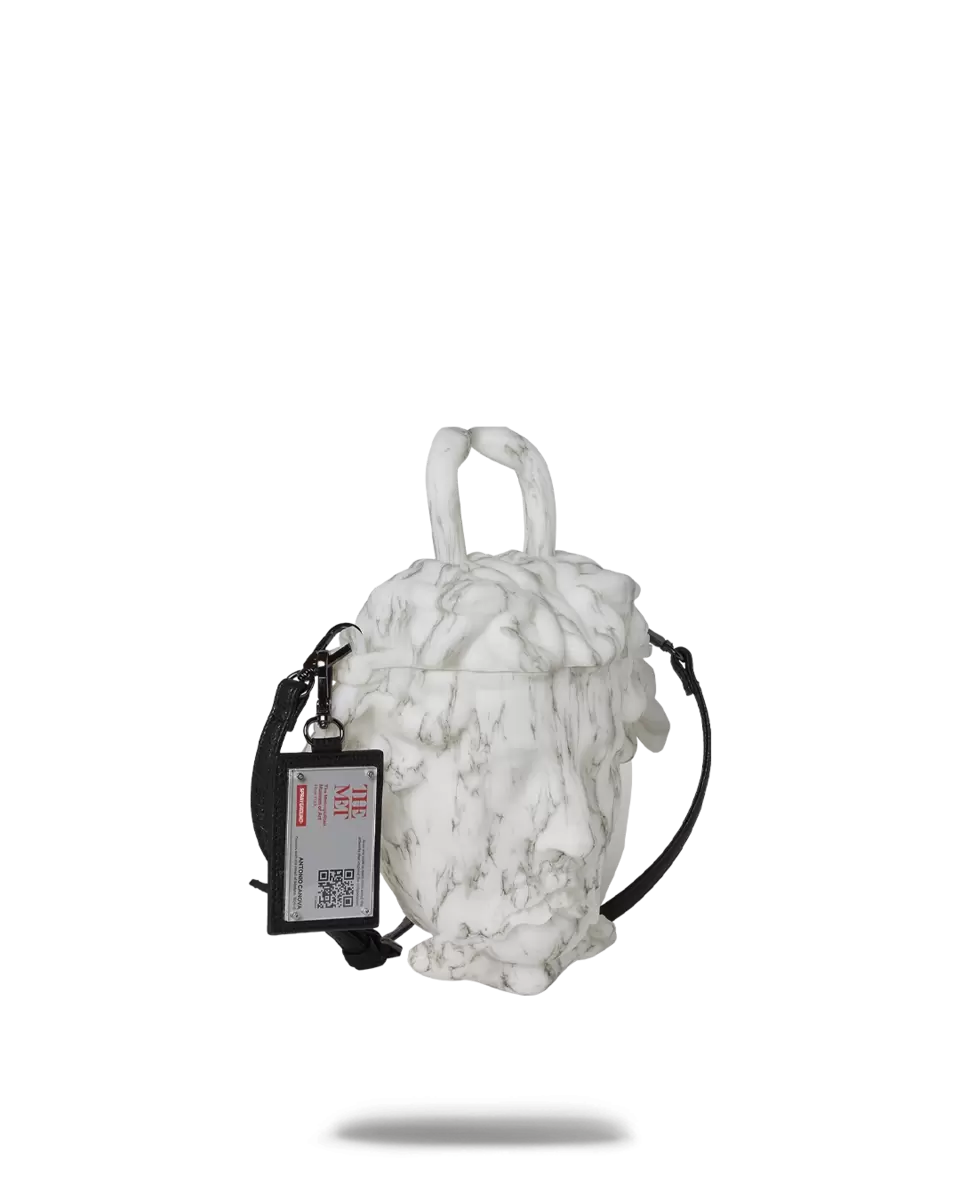 Diese atemberaubende Handtasche ist eine Hommage an Antonio Canovas (italienisch, 1757–1822) „Perseus mit dem Haupt der Medusa“ (1804–1806), eine monumentale Skulptur aus der Sammlung des Metropolitan Museum of Art. Sie feiert den Sieg des griechischen Helden Perseus über Medusa, die monströse mythologische Gorgone, die für ihr Schlangenhaar und ihren todbringenden Blick gefürchtet war, der jeden, den sie ansah, zu Stein erstarren ließ. Canova verewigt Perseus’ Triumph über Medusa meisterhaft, deren Bildnis seit jeher als Sinnbild des Bösen dient. Der Künstler galt allgemein als der bedeutendste Bildhauer seiner Zeit, und sein imposantes Meisterwerk in den Sammlungen des Museums spiegelt seine Bewunderung für die Kunst der Antike wider. Diese einzigartige Tasche integriert ein Sprayground-Element, unser charakteristisches Haifischmaul.