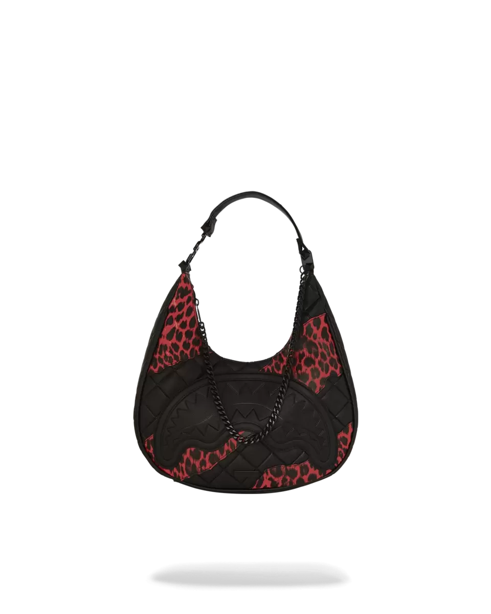 Gesteppte Handtasche mit aufgenähtem Leopardenmuster, geprägtem Haifischmaul und Ketten-Reißverschlussanhänger.
