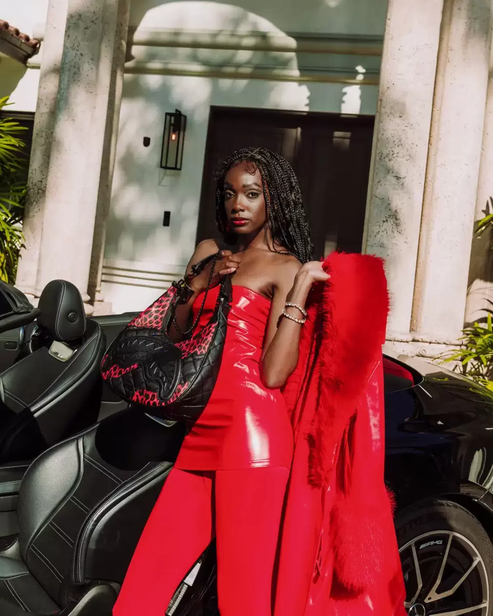 Anthrazitfarbene Kette am Reißverschluss, Nieten und SG-Griffdetail sowie eine Innentasche.