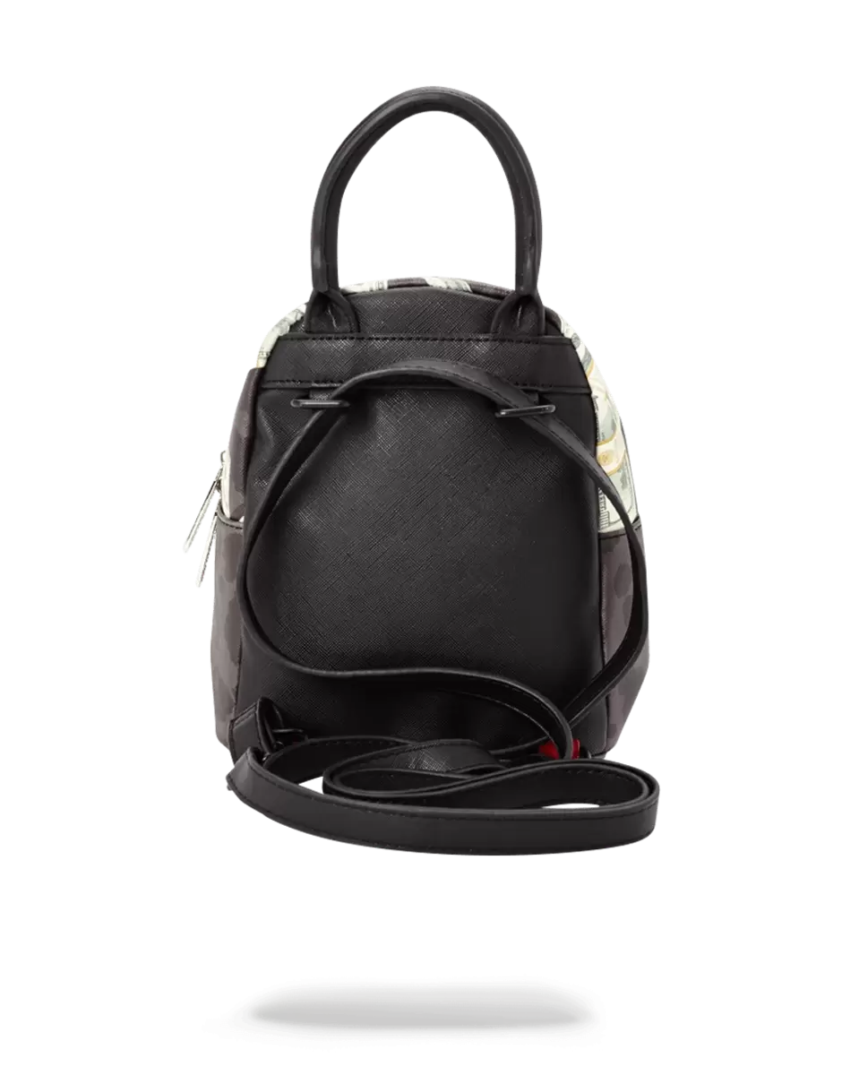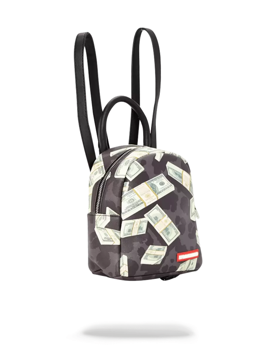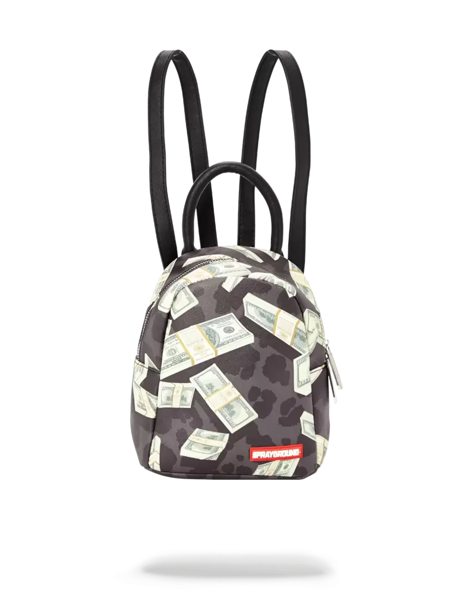 Kleine Tasche aus Kunstleder mit dünnen Riemen und aufgedrucktem Geldscheinmuster auf schwarzem Leopardenmuster. Kann als Rucksack oder Handtasche getragen werden. Maße: 16,5 x 20,3 x 9,5 cm.