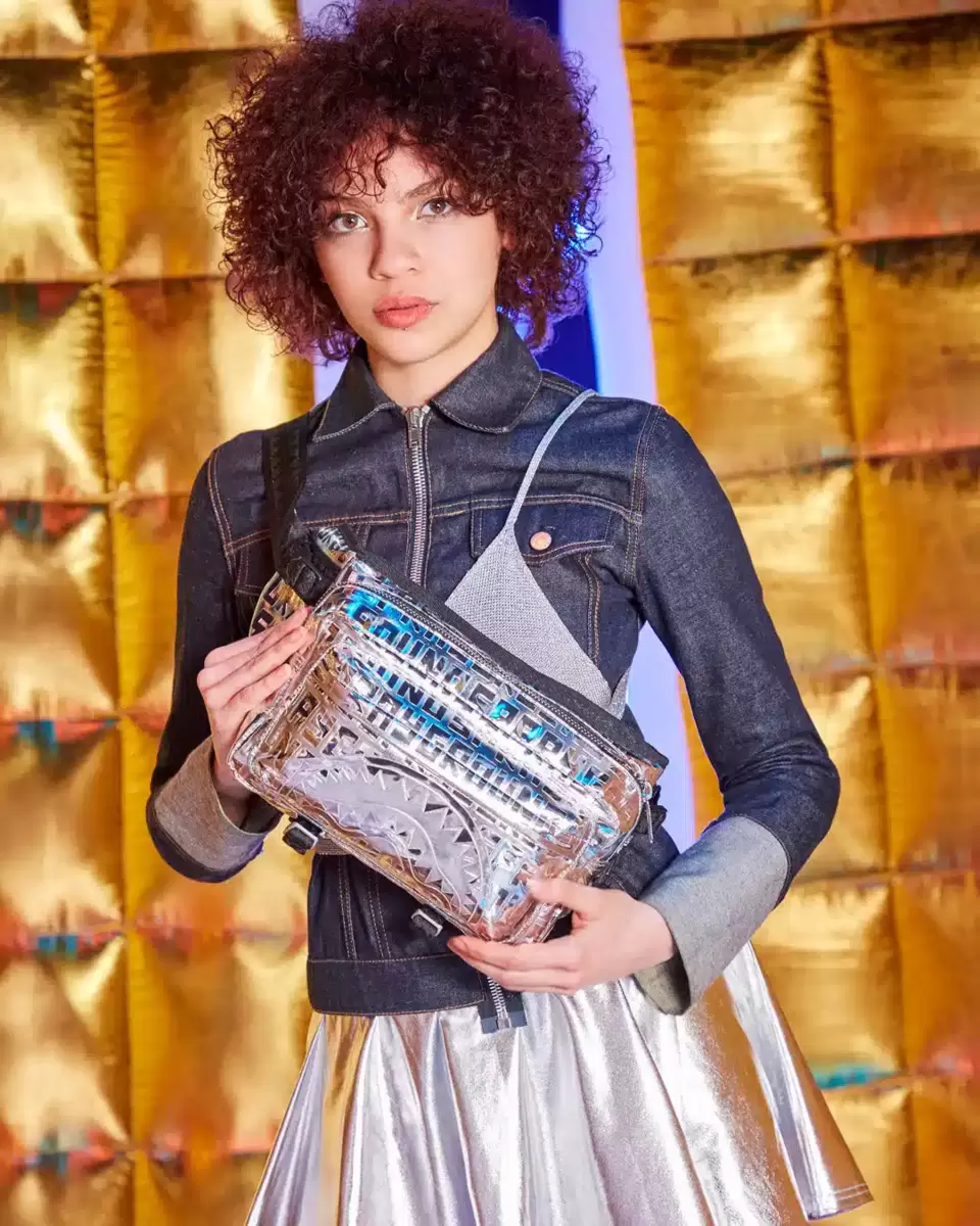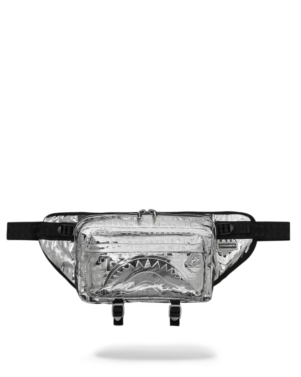 Geprägtes Sprayground-Logo auf metallisch-silbernem PU mit spiegelndem Glanz