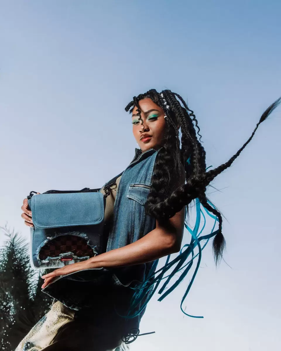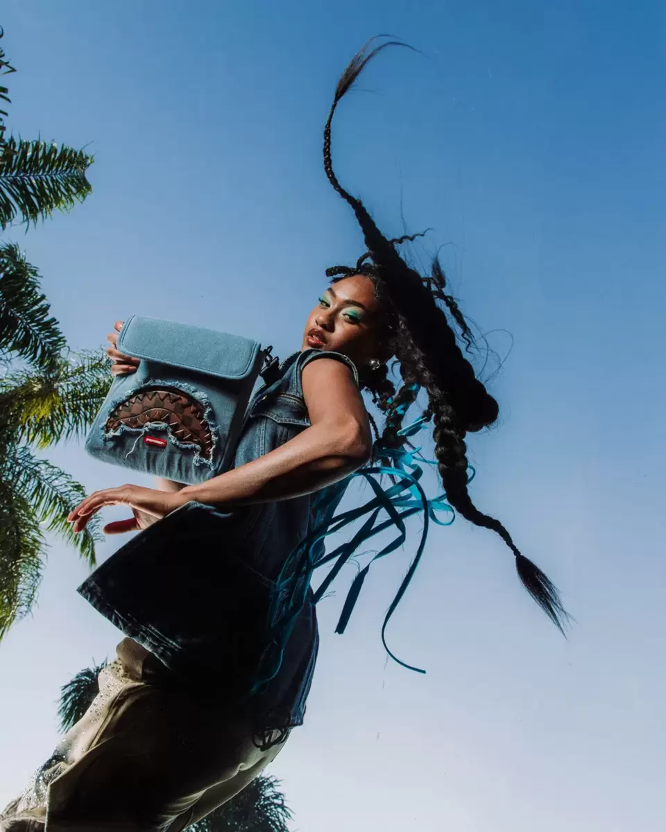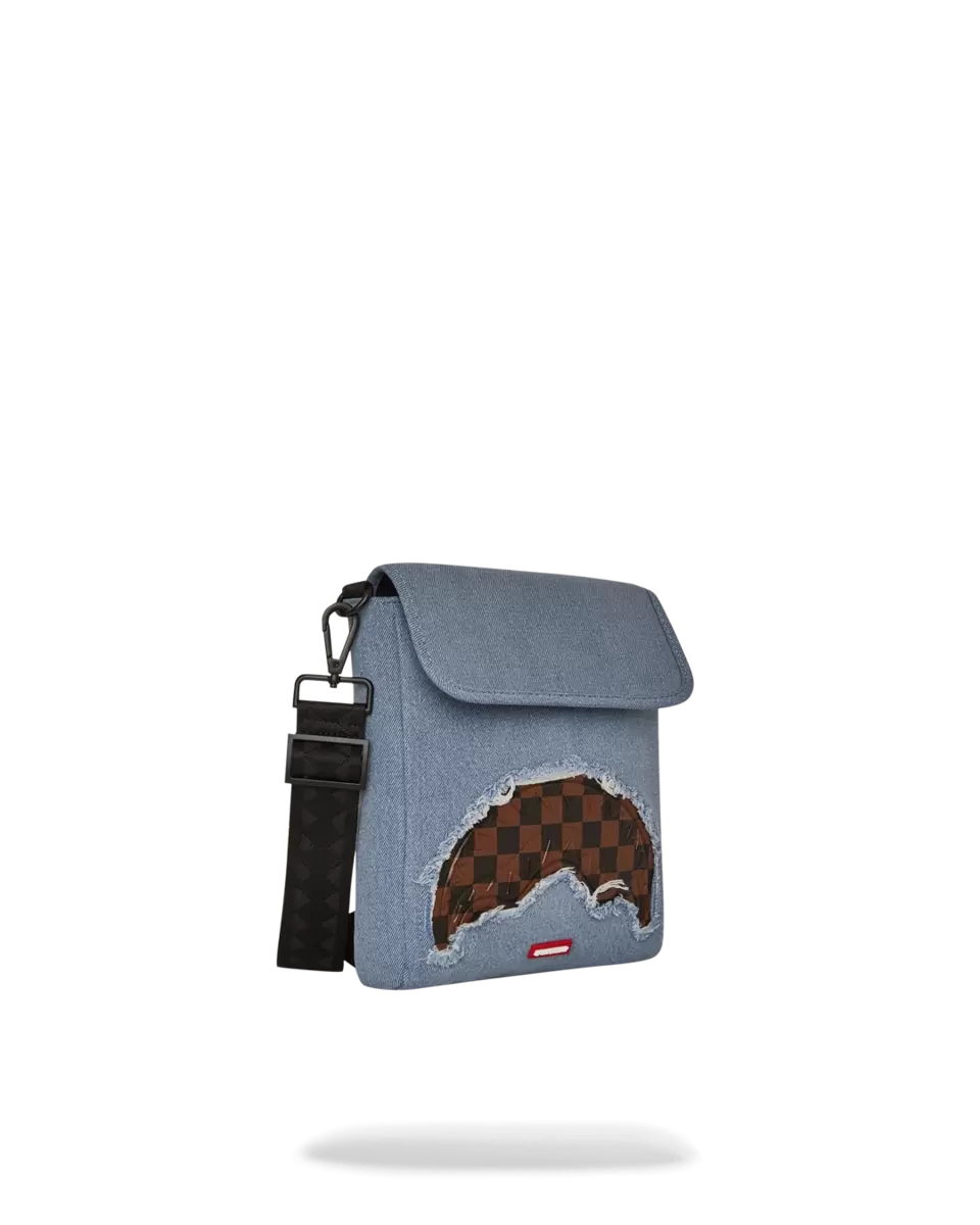 Tasche aus 100 % Baumwoll-Denim mit geprägten Details wie Haifischmaul und Reißverschlussanhängern. Ziernähte Kunstlederdetails an der vorderen Reißverschlusstasche. Verstellbarer Schultergurt.