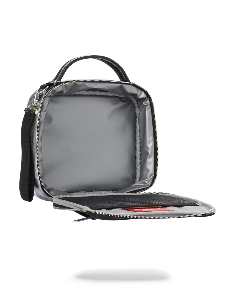 Abmessungen: 21,6 x 7,6 x 21,6 cm Doppelter Reißverschluss Tragegriff Abnehmbarer Seitengriff Silberfarbene Reißverschlüsse mit Metallbeschlägen Reißverschlusstasche