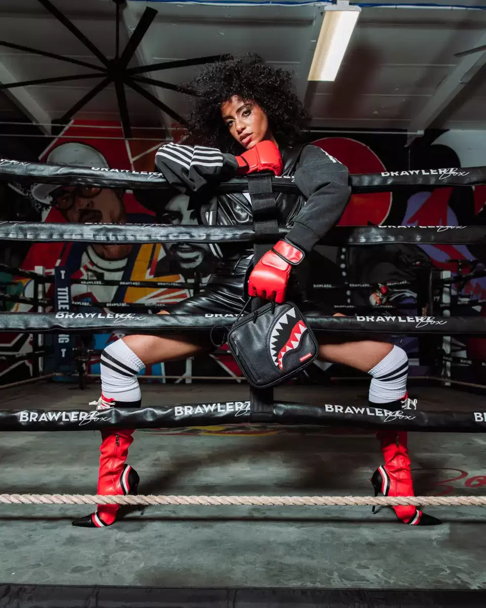 Abmessungen: 21,6 x 7,6 x 21,6 cm Doppelter Reißverschluss Tragegriff Abnehmbarer Seitengriff Rote Reißverschlüsse mit Metallbeschlägen Reißverschlusstasche