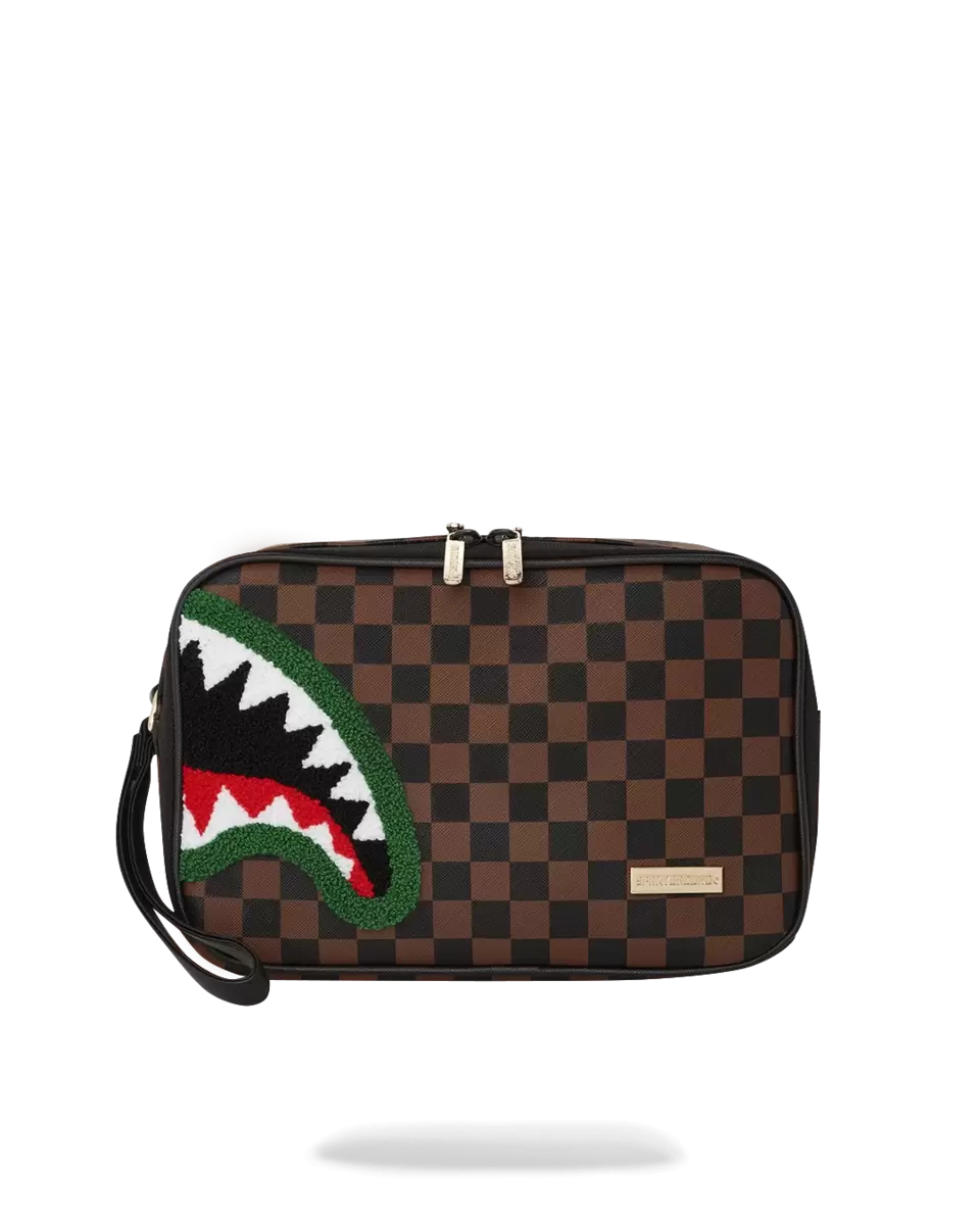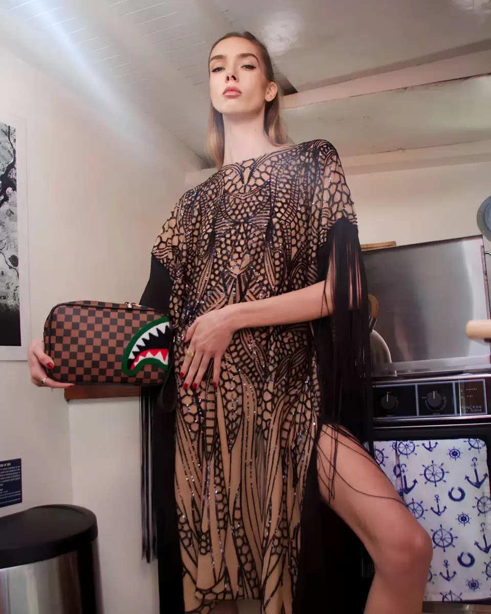 100 % PVC, Karomuster „Sharks in Paris“ auf PVC-Material mit strukturiertem Chenille-Haifischmaul und goldfarbenen Beschlägen