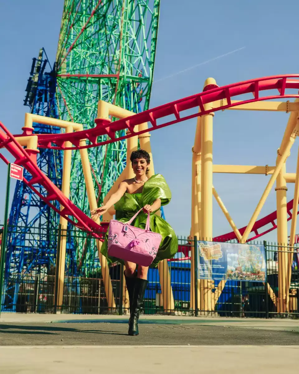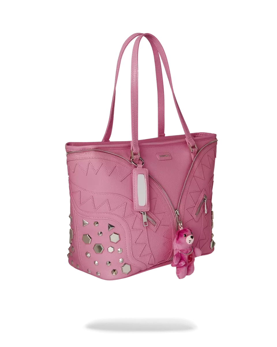 PVC mit doppeltem Haifischmaul-Ausschnitt und Ziernähten, dekorativen Reißverschlussdetails mit einem Plüschbären, der von der Mitte herabhängt, Seitenwänden mit silbernen Metallnieten und einem hängenden Spiegel-Schlüsselanhänger