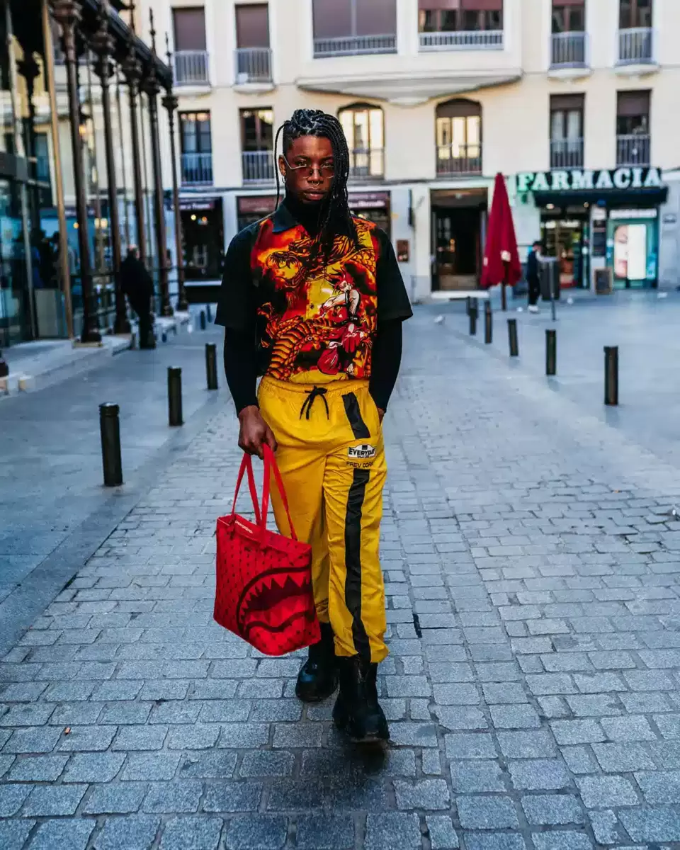 Abmessungen: 48 x 16,5 x 29 cm Reißverschlussöffnung oben Doppelter Tragegriff oben Sprayground-Schlüsselanhänger Goldfarbene Reißverschlüsse mit Metallbeschlägen