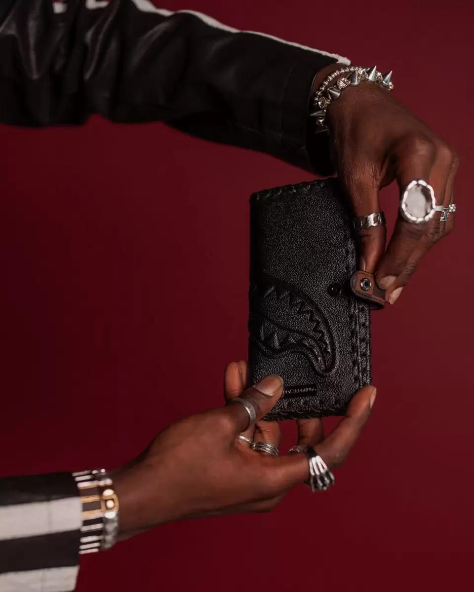 PVC-Geldbörse mit geprägten Details wie Haifischmaul und Reißverschlussanhängern. Ziernähte Kunstlederdetails um die vordere Reißverschlusstasche.