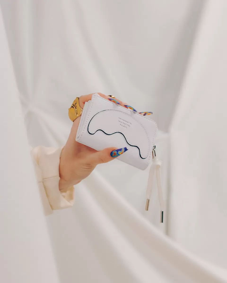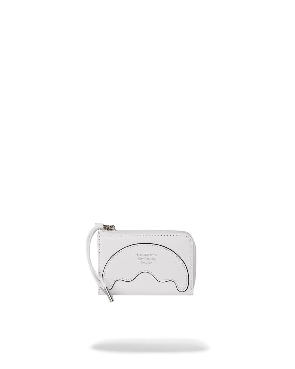 Geldbörse in Haifischmaulform mit geprägter silberner Schrift. 4,5 cm breit x 3,5 cm lang, 5 Kartenfächer, Gummizugverschluss, Ausweisfach, Geldscheinfach, Taschen