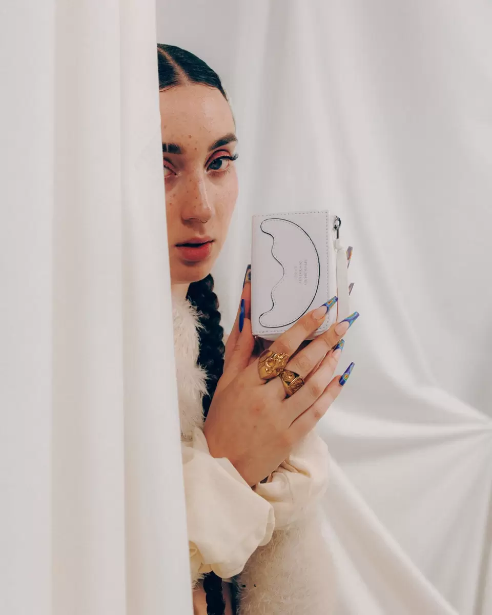 Ausgeschnittene und genähte Haifischmaulform mit geprägter silberner Folienbeschriftung.