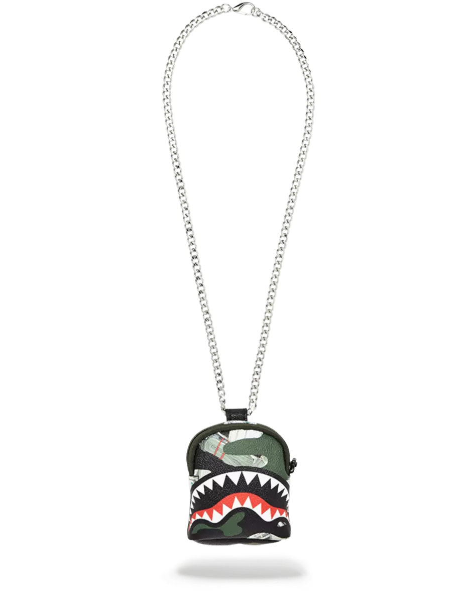 Rucksackkette mit Tarnmuster und Geldhai-Motiv