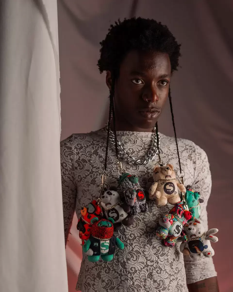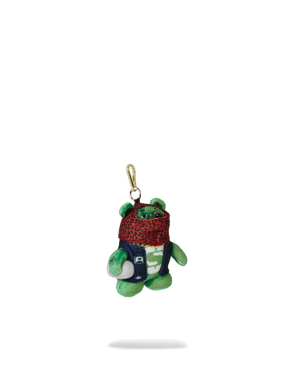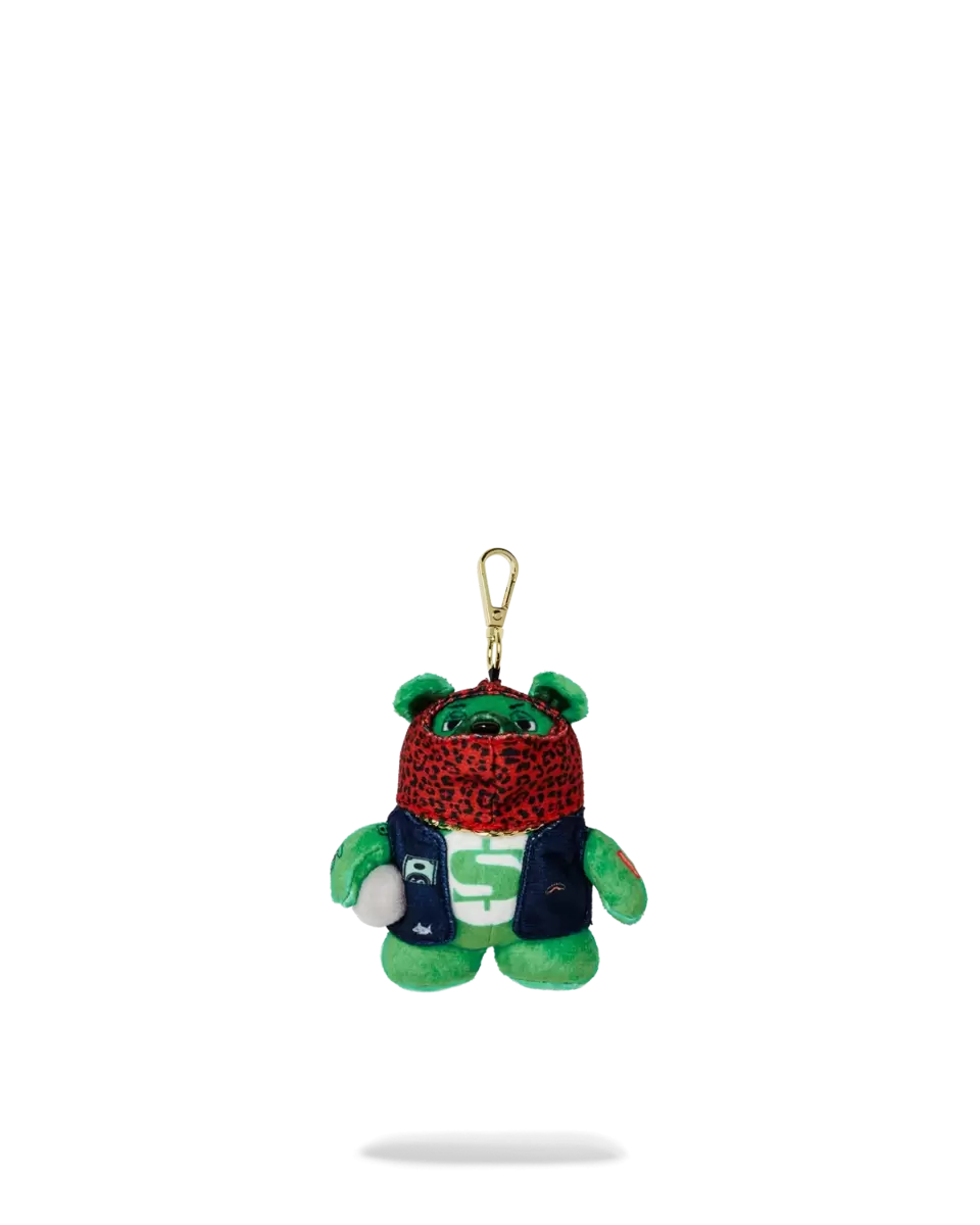 Der perfekte Begleiter. Plüschbär-Schlüsselanhänger mit Skimaske, Weste und Kette.