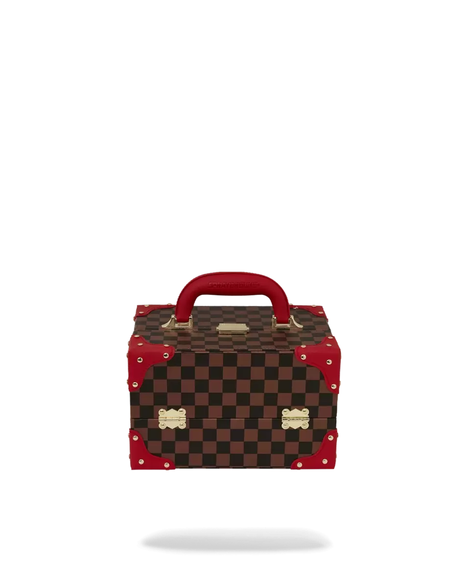 PRODUKTDETAILS Rote Zierleisten mit besonderen goldenen Hardware-Details 100 % PU – geprägt mit Sprayground-Monogramm Größe 11 x 7 x 7, Rotes Veloursfutter, Abgestufte Regalböden