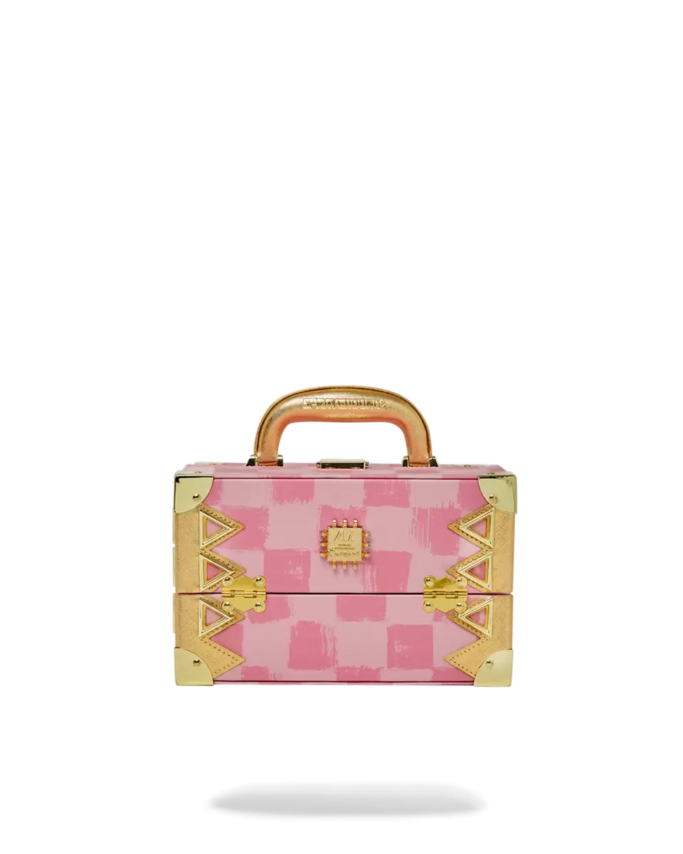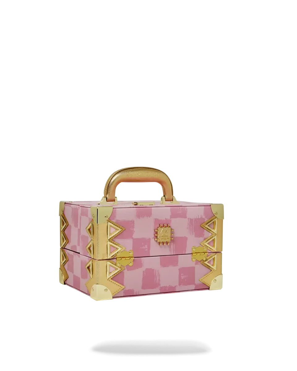 Rosa Veloursfutter, gestufte Regalböden, herausnehmbares Tablett, Innenspiegel.