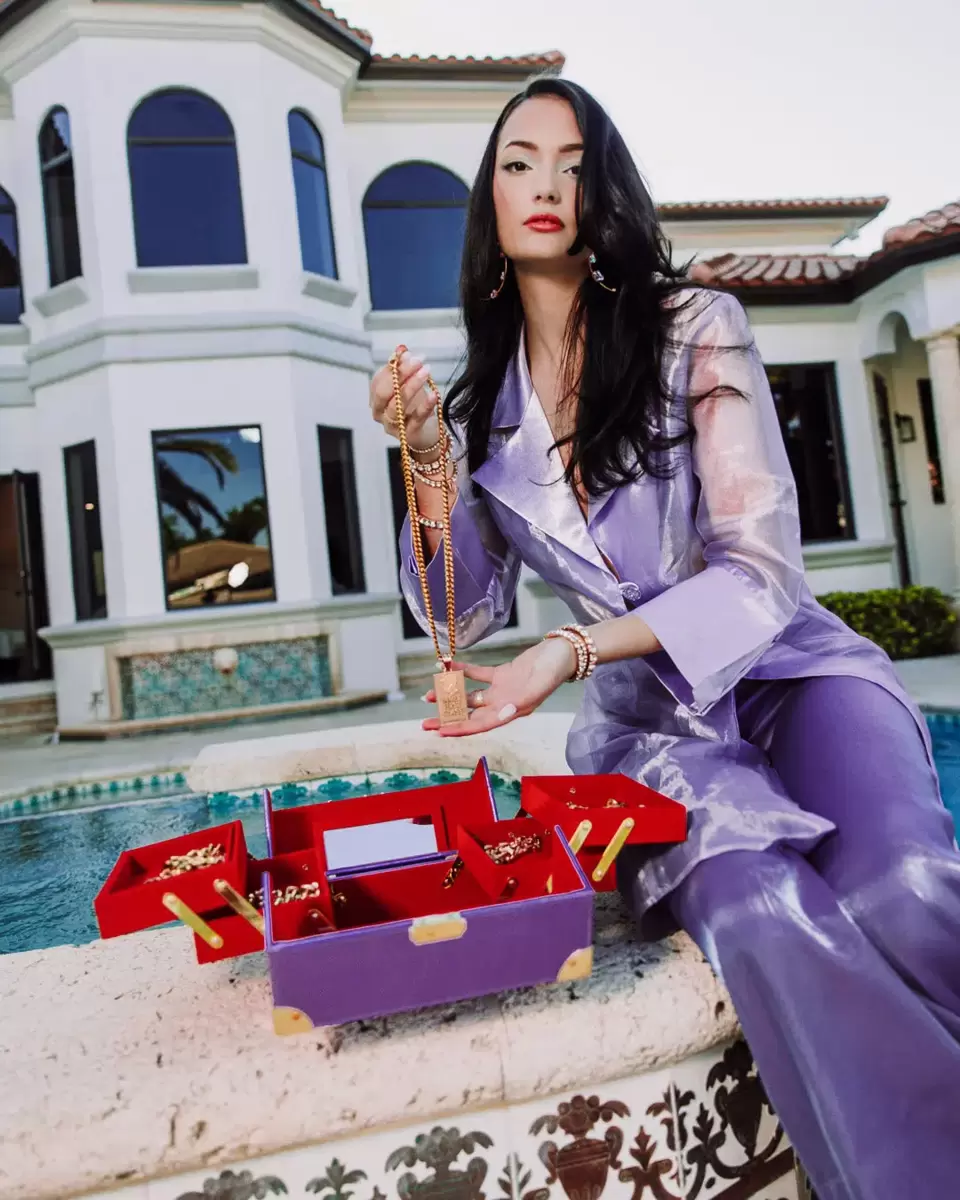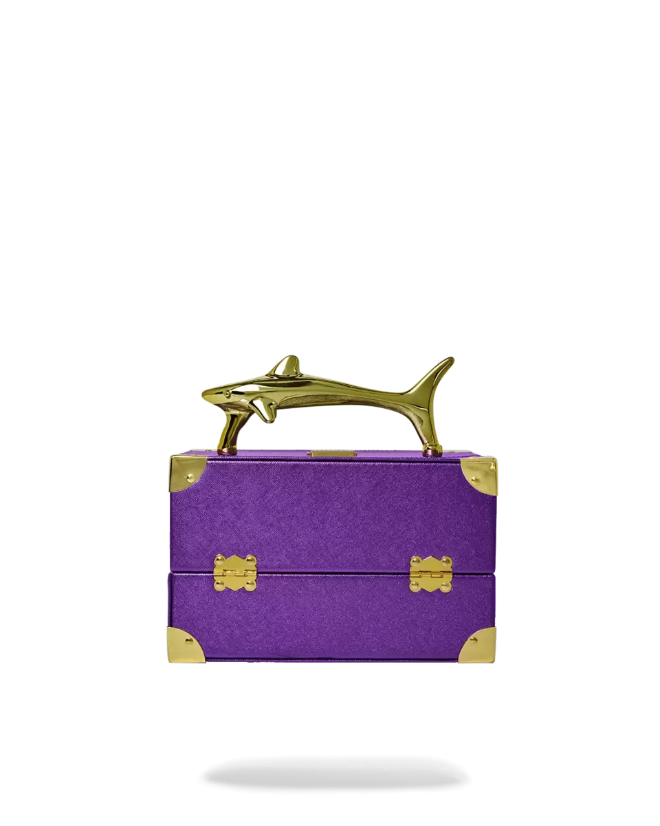 Funkelnd und glänzend! Individuell gestaltetes Schmuckkästchen mit Haifischgriff, bezogen mit metallisch-violettem Stoff und innen mit samtig-goldenem Futter. PRODUKTDETAILS: 100 % PVC, Größe 11.
