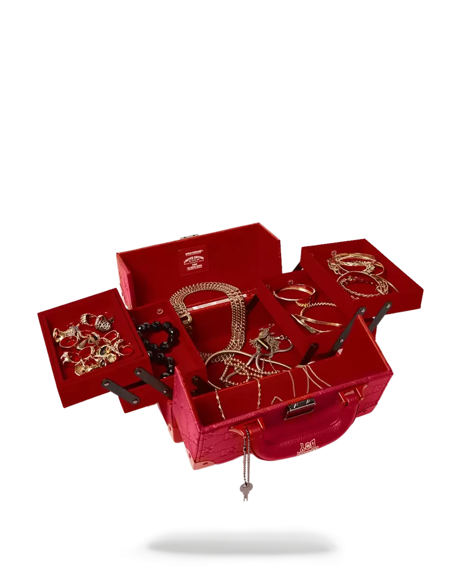 PRODUKTDETAILS 100% PU – geprägt mit Sprayground-Monogramm Größe 11, x 7, x 7, Rotes Veloursfutter, Ablagefächer, herausnehmbares Tablett, Innenspiegel.