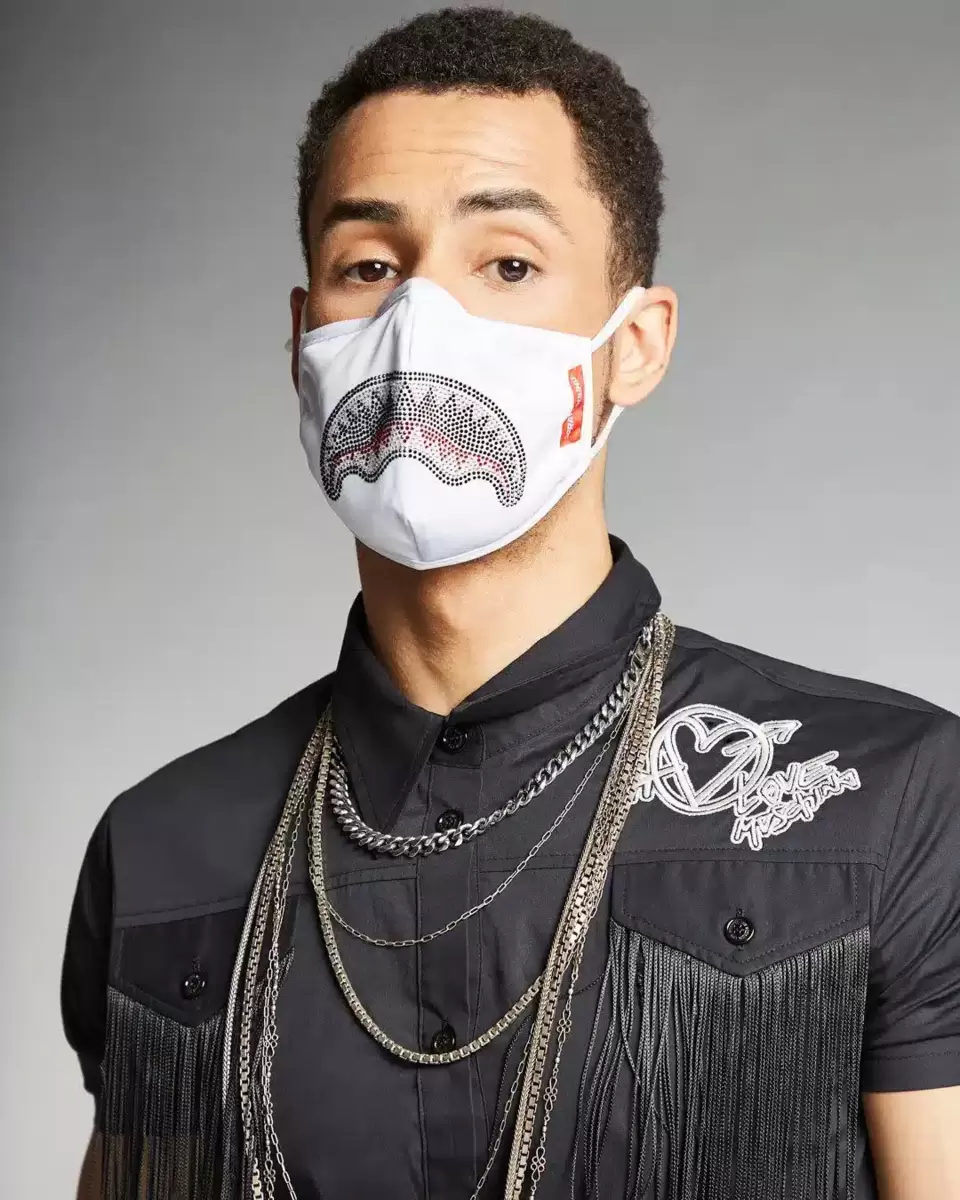 Mit Kristallverzierungen. Polyester- und Spandex-Gewebe mit 3-lagigem Filterschutz. Vierfach verstellbare, elastische Ohrschlaufen mit verstellbarem Verschluss.